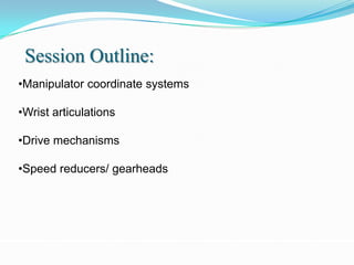 3) It discusses various drive mechanisms for robot motion including mechanical drives using ball screws or gears, and pneumatic, hydraulic, and electrical systems. It provides examples of speed reducers like harmonic drives and planetary gearheads.