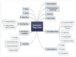This document provides an overview of schema therapy, its historical development, and theoretical foundations, highlighting its origins from cognitive behavioral therapy for treatment-resistant patients. It discusses early maladaptive schemas, coping styles, and schema modes, emphasizing the significance of childhood experiences in forming these patterns. The practical applications of schema therapy focus on assessing and modifying these schemas to improve therapeutic outcomes.