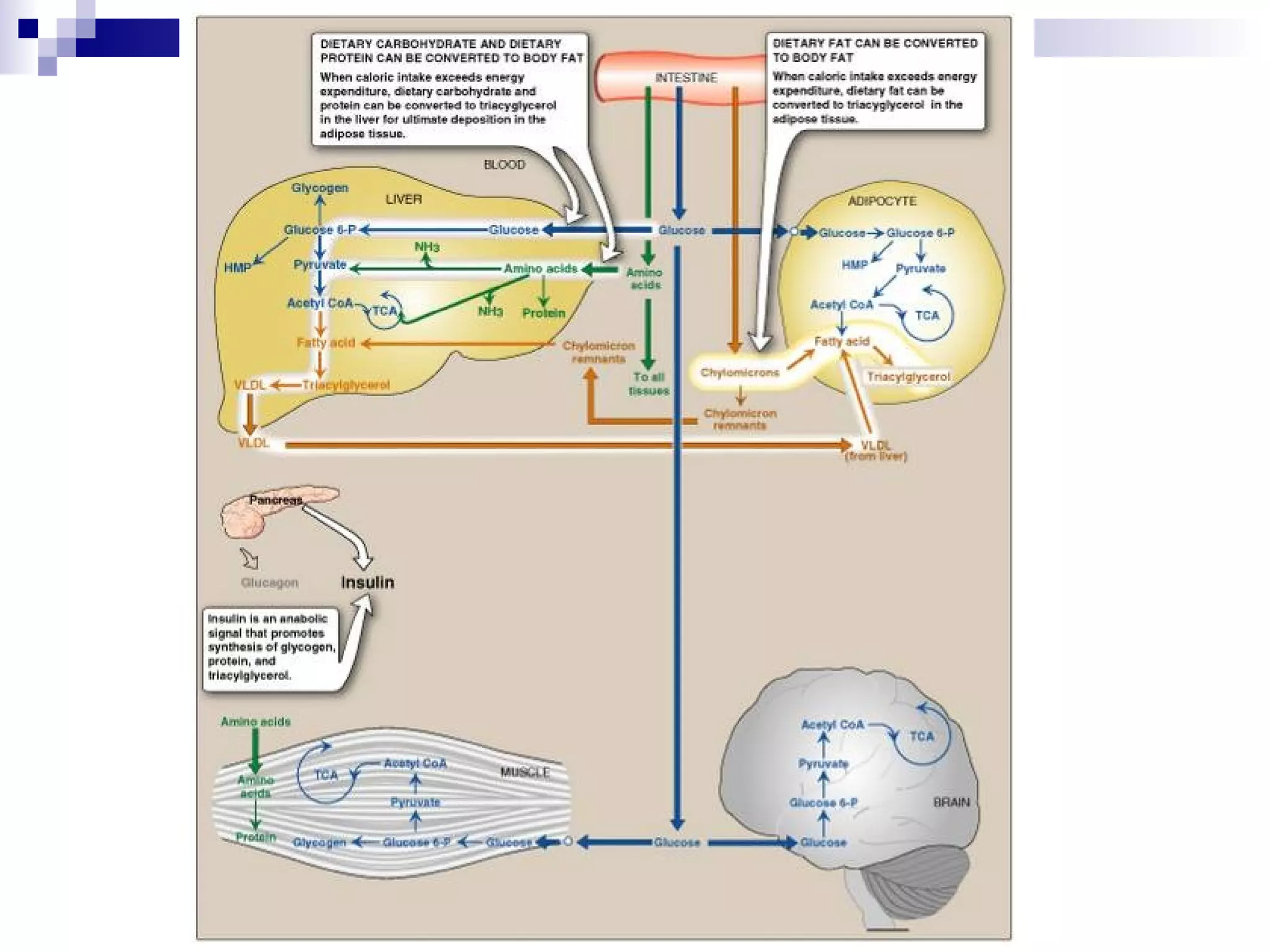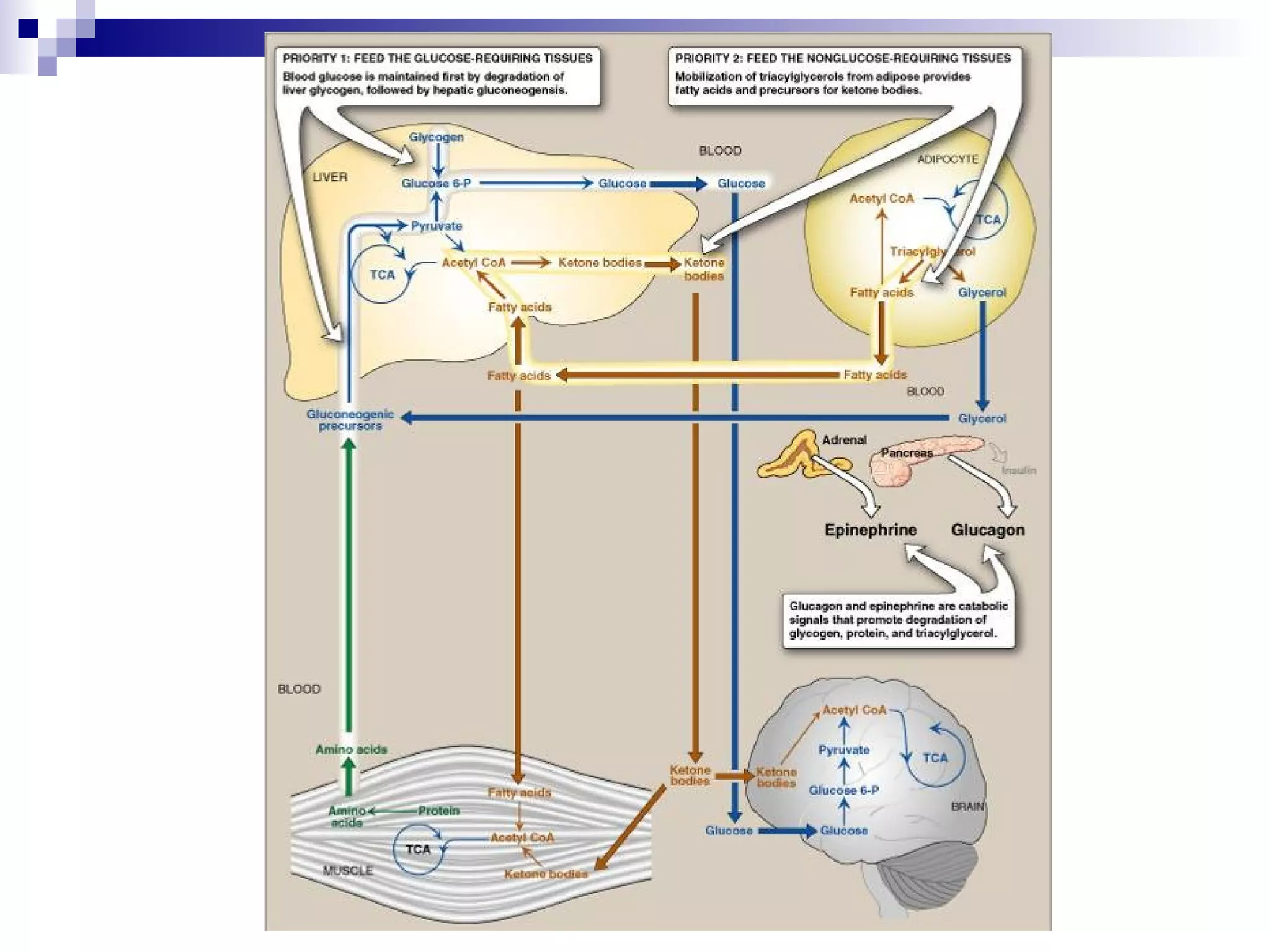 The document discusses various topics related to metabolic regulation and integration. It describes how the liver, adipose tissue, muscle, and brain are important organs for fuel metabolism. It also summarizes the roles of insulin and glucagon in regulating metabolism. Insulin promotes anabolic processes like glycogen synthesis and fat storage, while glucagon stimulates catabolic processes like gluconeogenesis to increase blood glucose. The document also provides information on fuel storage in the body and the key roles of glucose-6-phosphate, pyruvate, and acetyl-CoA as junction points in metabolic pathways.