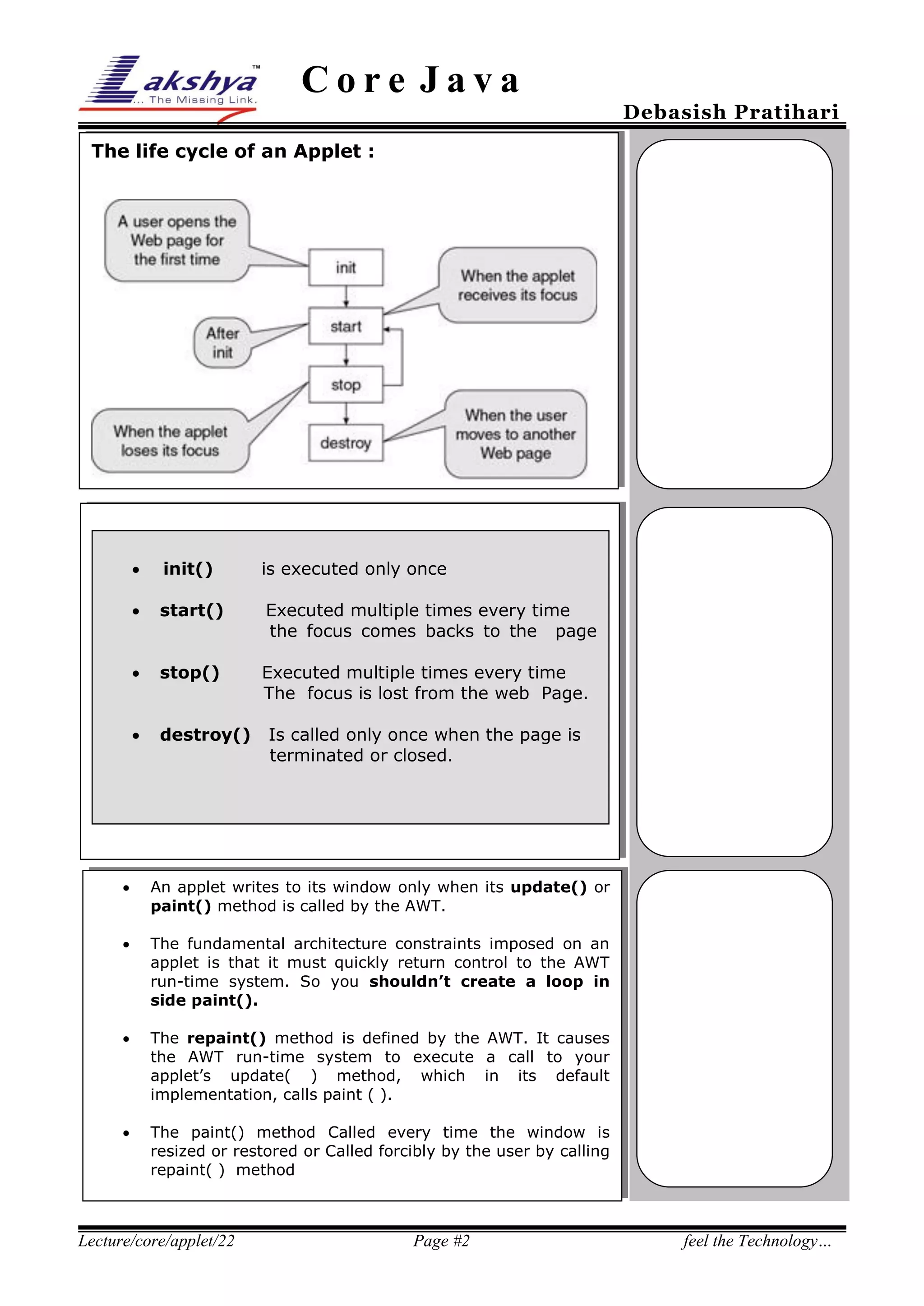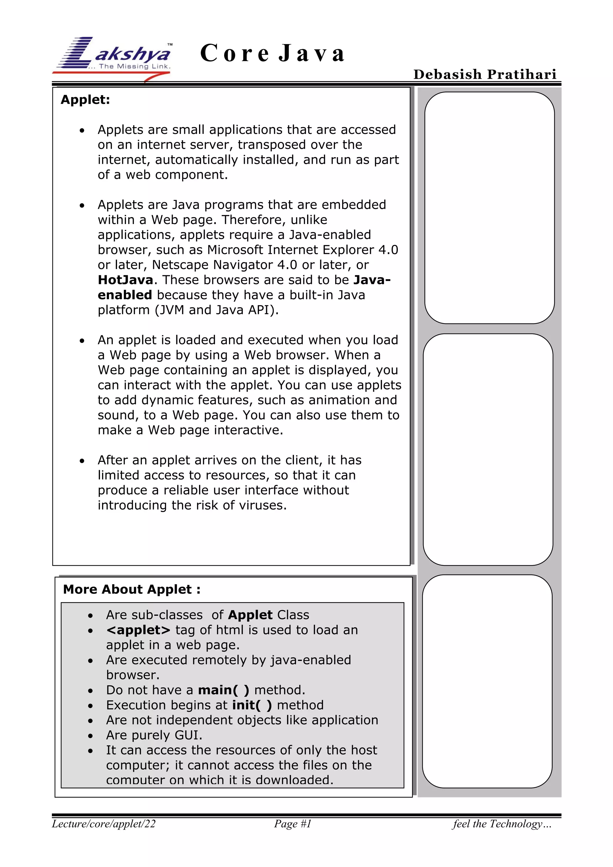 Applets are Java programs that are embedded within web pages. They are executed remotely by Java-enabled browsers and allow web pages to be interactive and dynamic. Applets have limited access to resources for security reasons. They have lifecycle methods like init(), start(), stop(), and destroy() that are called at different points in the applet's execution. Creating an applet involves subclassing the Applet class and overriding methods as needed, then embedding the applet in an HTML file using applet tags.
