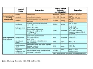 This document discusses different types of intermolecular and intramolecular forces. It begins by defining intramolecular forces as those within a molecule, such as covalent, ionic, and metallic bonds. Intermolecular forces are defined as those between different molecules, including ion-dipole, hydrogen bonding, dipole-dipole, and dispersion forces. The document then discusses how these different intermolecular forces relate to physical properties like boiling points, solubility, surface tension, and phase changes. It emphasizes that stronger intermolecular forces lead to higher boiling points, freezing points, and surface tension as well as differences in solubility between polar and nonpolar substances.