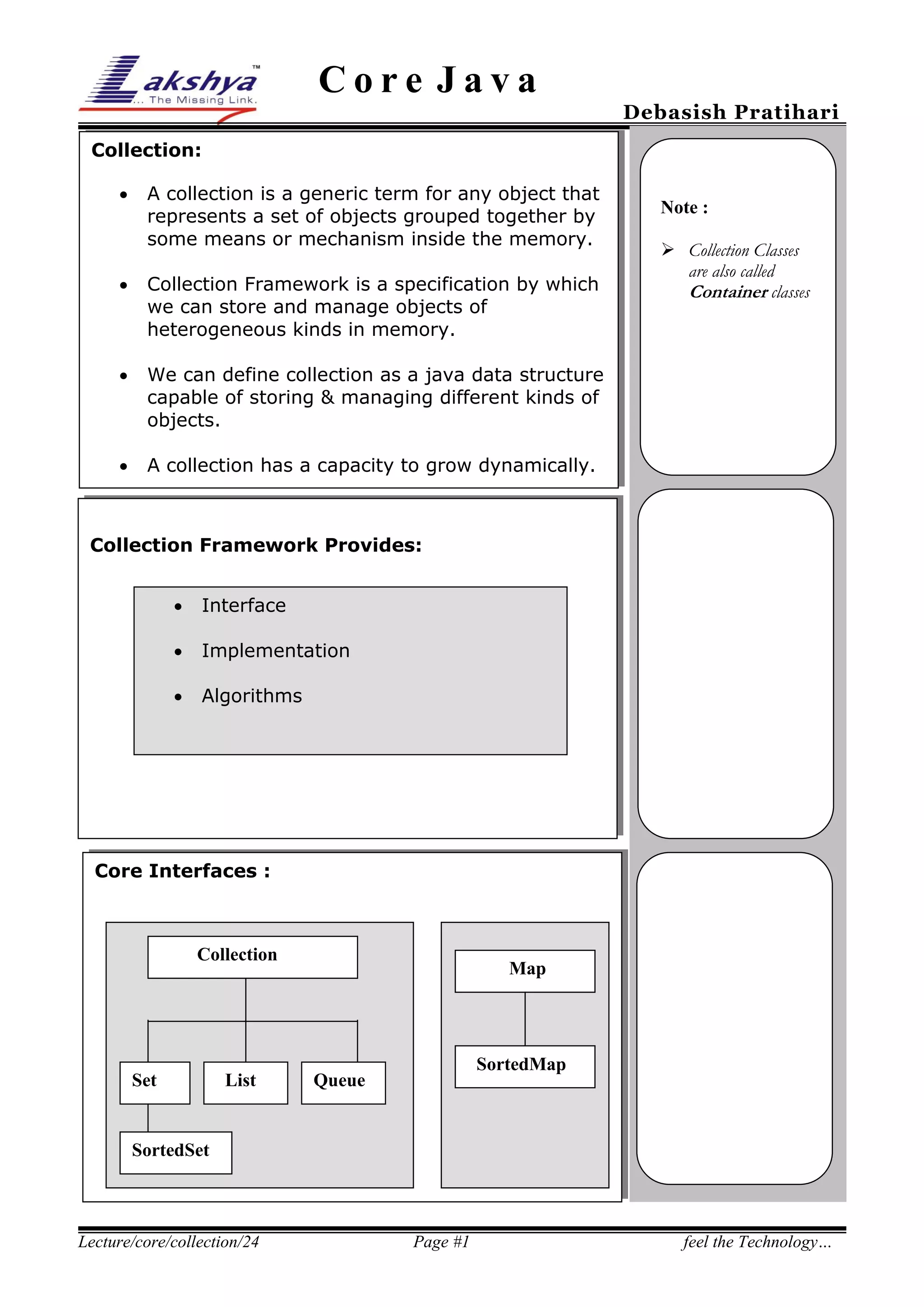 The document discusses Java collection framework. It defines a collection as a data structure capable of storing heterogeneous objects. There are three main types of collections - sets, lists, and maps. Sets cannot contain duplicate elements, lists allow duplicates and positional access, and maps store elements as key-value pairs. The core interfaces provided by the collection framework are Collection, Set, List, and Map. Common implementations of these interfaces include ArrayList, LinkedList, HashSet, TreeSet, HashMap and TreeMap. The document also covers traversing collections using iterators and list iterators, as well as examples of using sets, lists and maps.