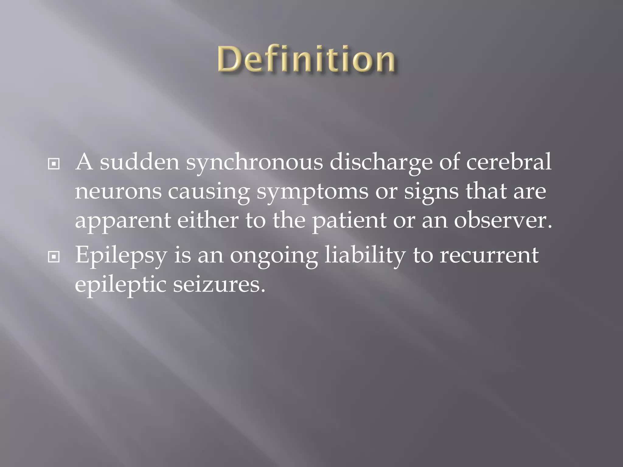 Epilepsy is characterized by recurrent seizures resulting from sudden neuronal discharges in the brain, with a prevalence of 0.7-0.8%, particularly affecting individuals at the extremes of age. Seizures can be categorized into partial, generalized, and unclassified types, each with distinct clinical patterns and potential causes, including structural brain lesions and metabolic disorders. The diagnosis of epilepsy is primarily clinical, and treatment often includes antiepileptic drugs to manage seizures and minimize recurrence.