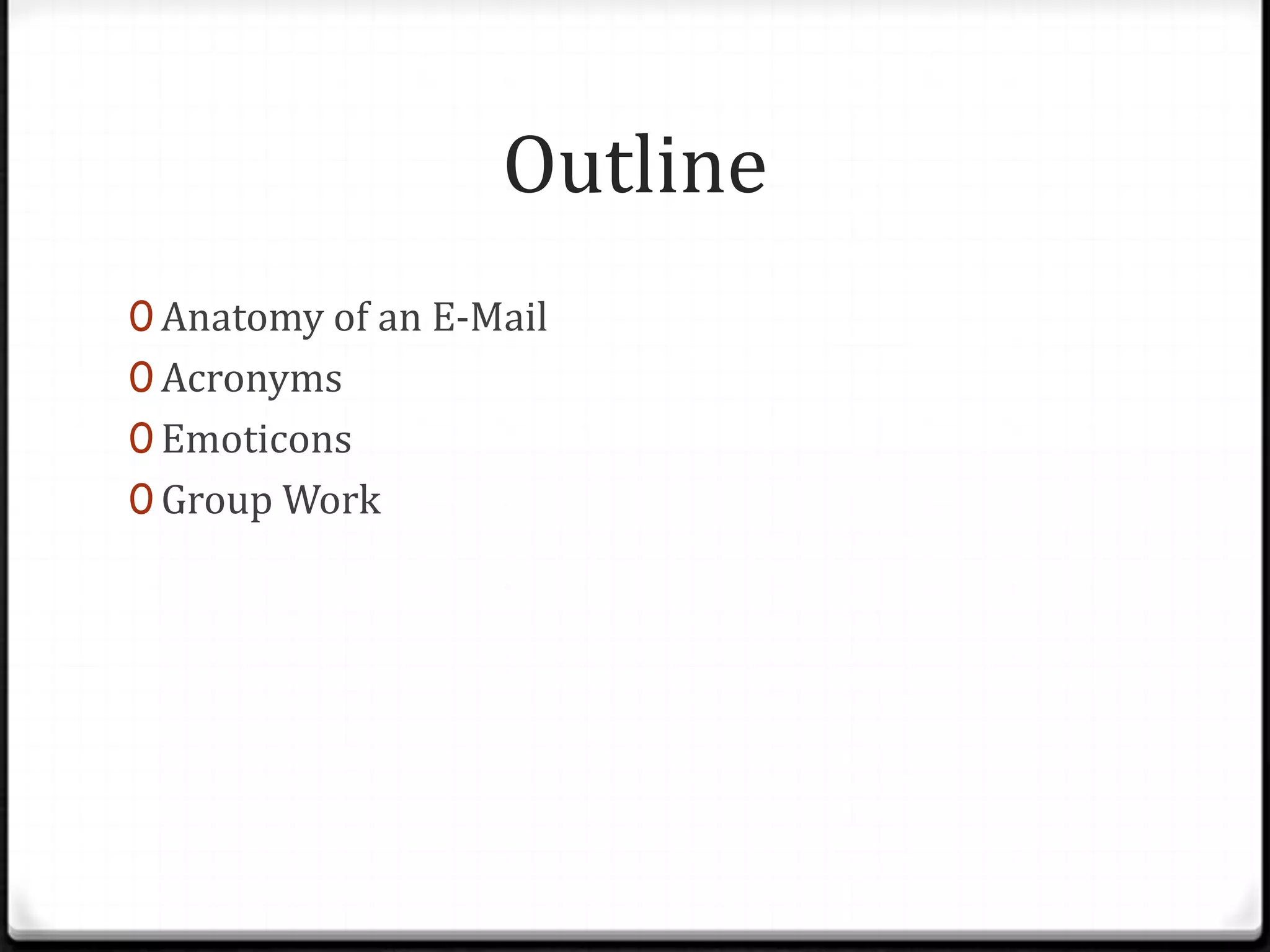 This document provides information about proper email etiquette and structure. It discusses: