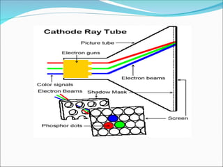 The document covers various types of display technologies, including CRTs, raster-scan displays, random-scan displays, and flat-panel displays like plasma, LED, and LCD. It explains the working principles of each display type, their advantages and disadvantages, and how they produce images and colors. Additionally, it details methods for displaying color, resolution, and refresh rates specific to each display technology.