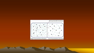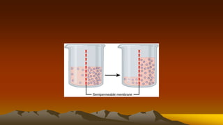 This document provides an overview of plasmolysis and osmosis in plant cells. It defines plasmolysis as when plant cells lose water and shrink away from their cell walls after being placed in a hypertonic solution. Osmosis, which is responsible for plasmolysis, is the movement of water across membranes from areas of higher water concentration to lower concentration. The document describes different types of plasmolysis (concave, convex) and explains how solutions can be hypotonic, isotonic, or hypertonic relative to plant cells. It also distinguishes osmosis, the movement of water, from diffusion, the movement of molecules.