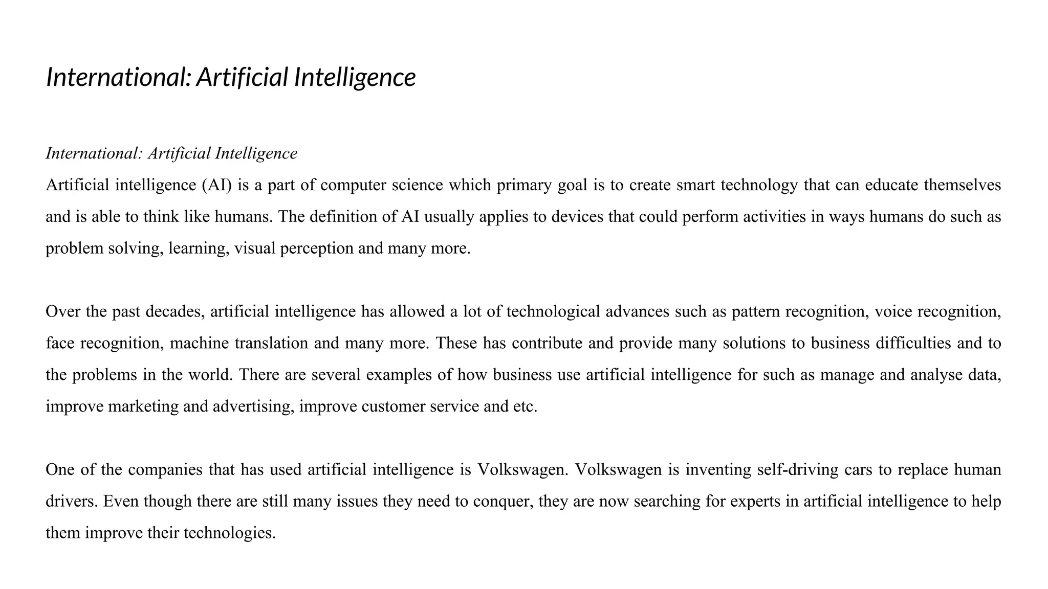 Artificial intelligence (AI) is a part of computer science that aims to create smart technologies that can learn autonomously and think like humans. AI has allowed technological advances in areas like pattern recognition, machine translation, and more. Companies are using AI to manage and analyze data, improve marketing, and enhance customer service. For example, Volkswagen is developing self-driving cars using AI experts to improve its technologies.