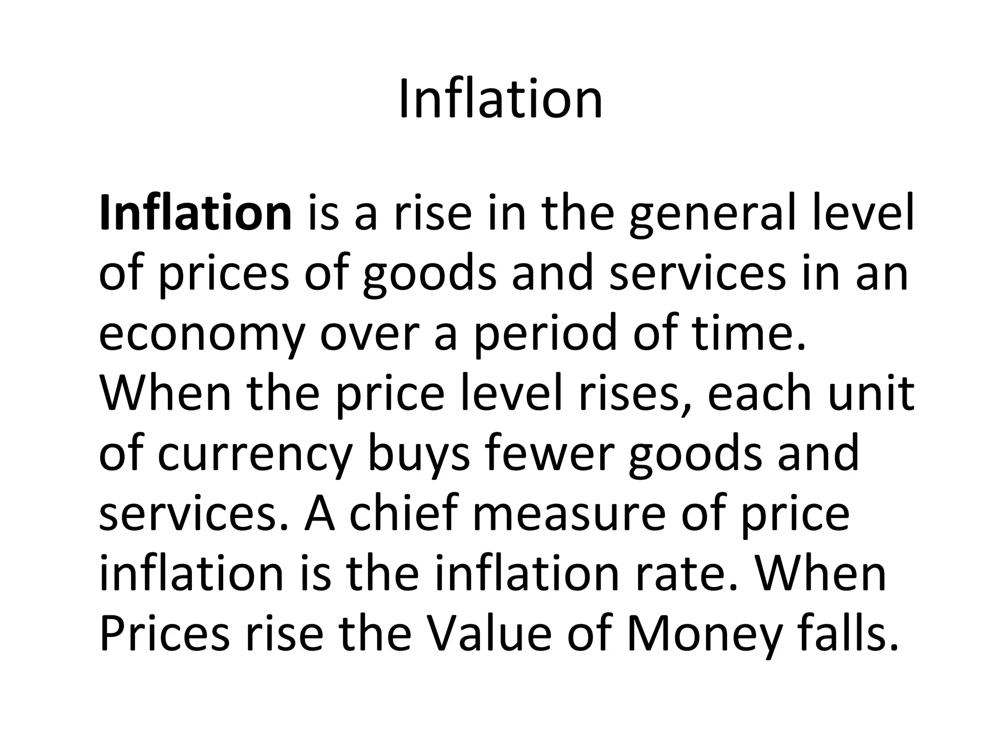 1) The different stages and types of inflation including creeping, walking, running, and hyper inflation.
