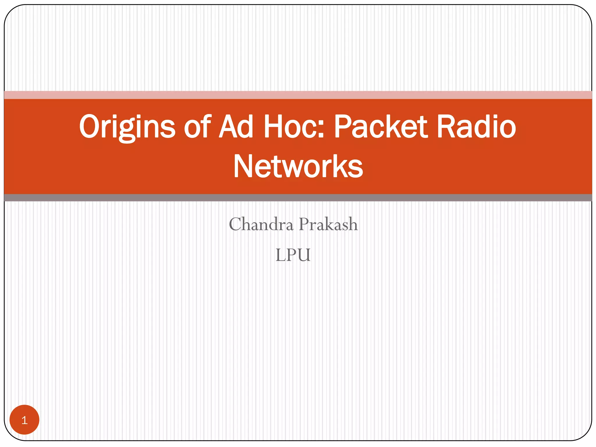 This document discusses the origins and development of ad hoc networks. It describes how packet radio networks (PRNETs) in the 1970s, developed by DARPA, were the first generation of ad hoc networks. PRNETs used multi-hop routing between mobile radio terminals and packet radios to communicate without fixed infrastructure. The document outlines the key components and routing techniques of PRNETs, including point-to-point and broadcast routing. It also discusses how subsequent generations in the 1980s-1990s focused on improving performance, scalability, and developing commercial applications like Bluetooth.