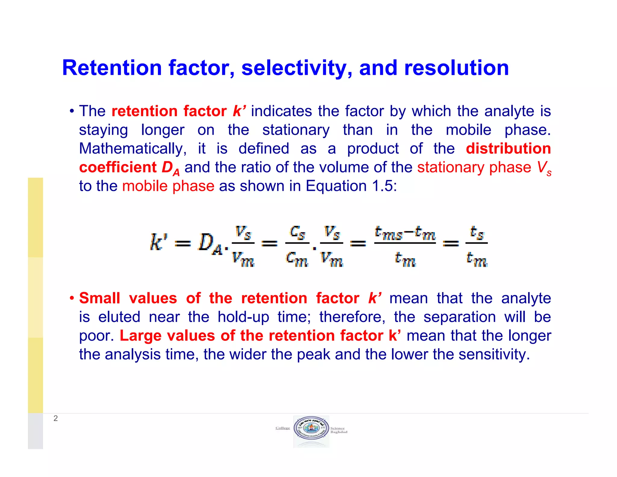 The document discusses key concepts in chromatography, focusing on retention factor, selectivity, and resolution. It explains how these metrics impact the separation quality of analytes in a mixture, emphasizing the importance of achieving high resolution for effective analysis. Additionally, it outlines the plate theory and dynamic theory that underlie chromatographic processes.