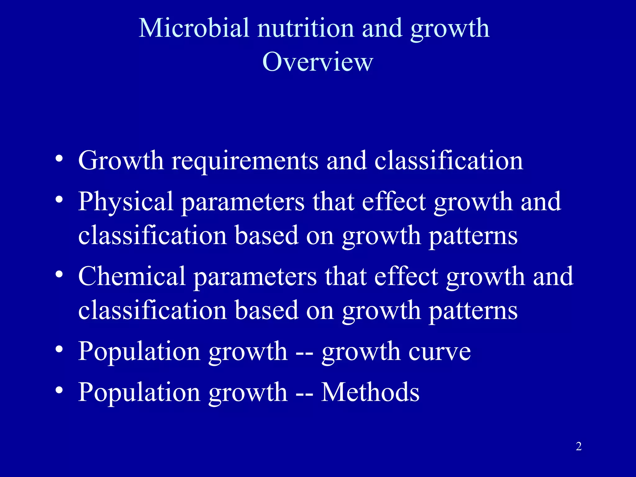 This document discusses microbial nutrition and growth. It covers the classification of microorganisms based on their temperature, pH, osmotic pressure, and oxygen requirements. Key points include: