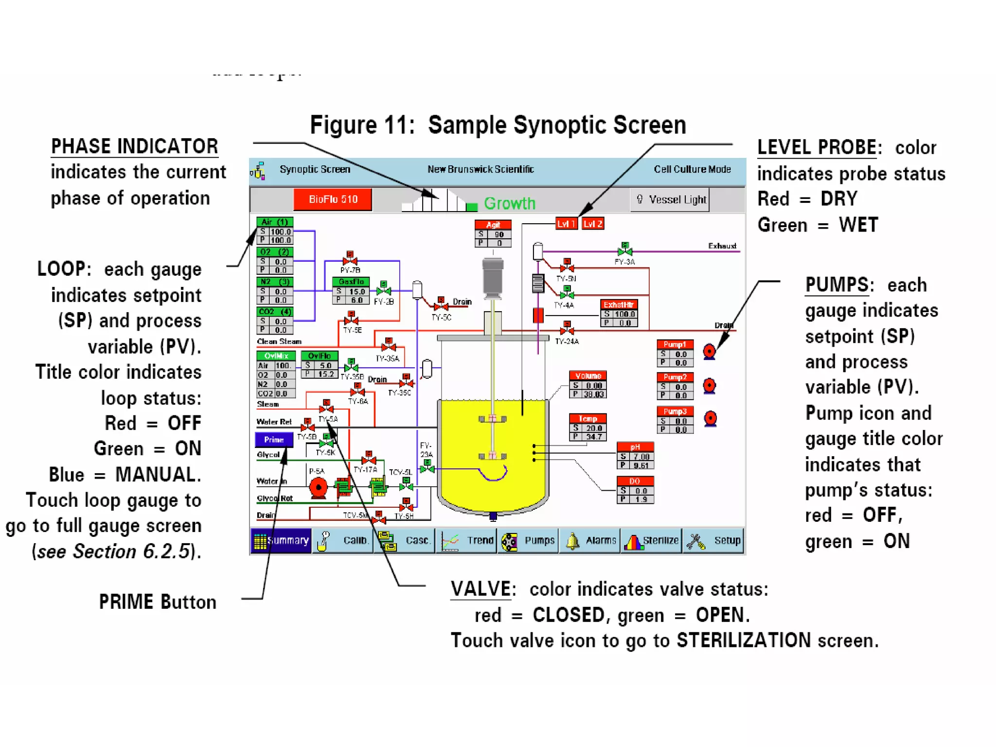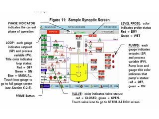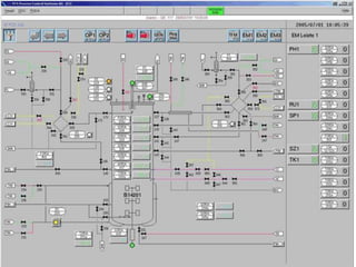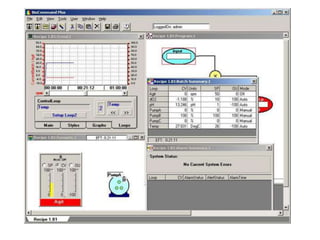 This document discusses bioprocess control for cell cultivation systems. It covers various parameters that are measured for control, including cell inputs and outputs, substrate levels, oxygen, carbon dioxide, temperature, pH, dissolved oxygen, and foam. Sensors used for online measurement of these parameters in bioreactors are also outlined. The document then describes basic feedback loops and controllers for bioprocess control, including PID and model predictive control. It concludes with an overview of using a supervisory control and data acquisition (SCADA) system connected over Ethernet for monitoring and controlling bioreactor systems.