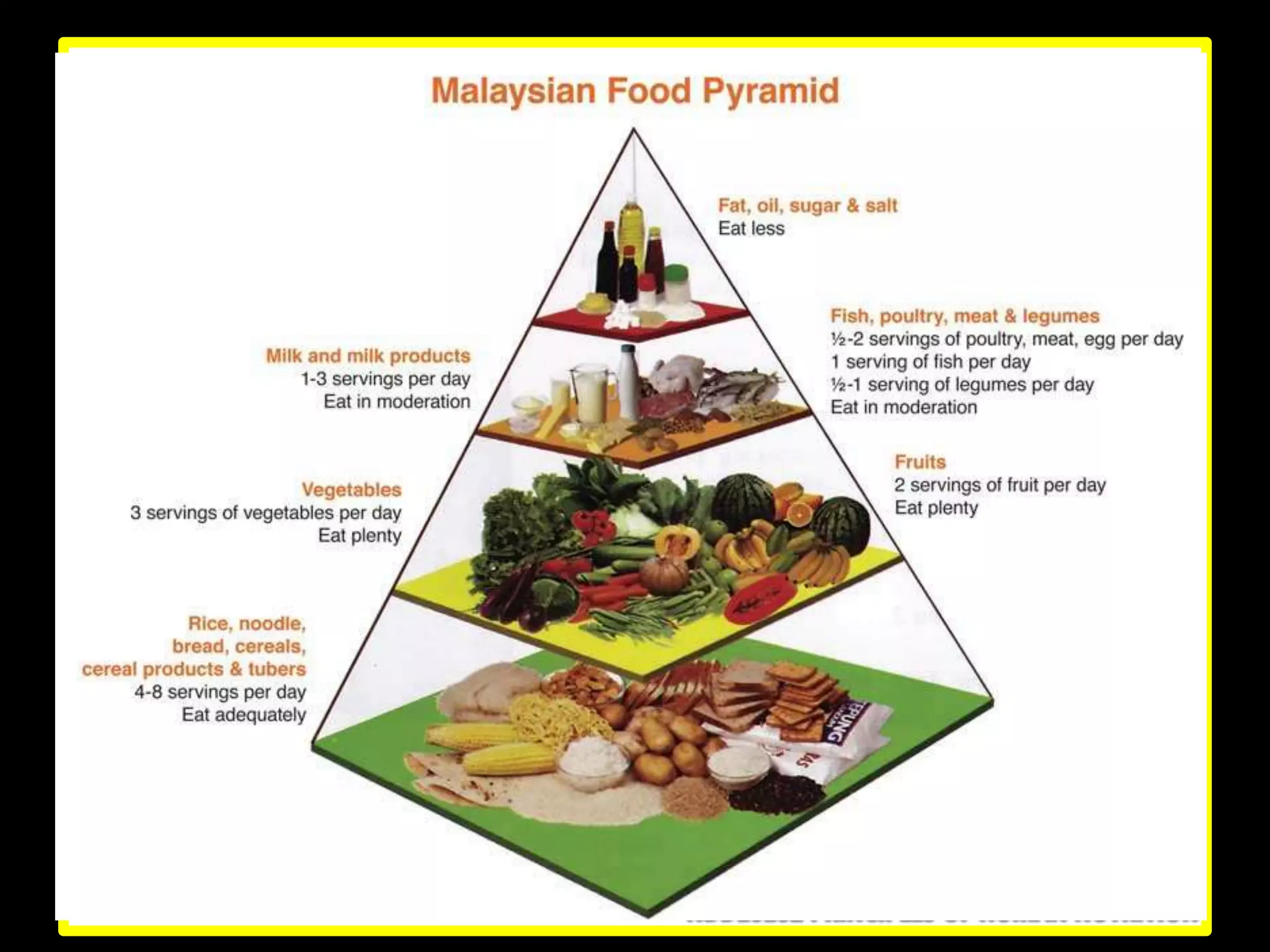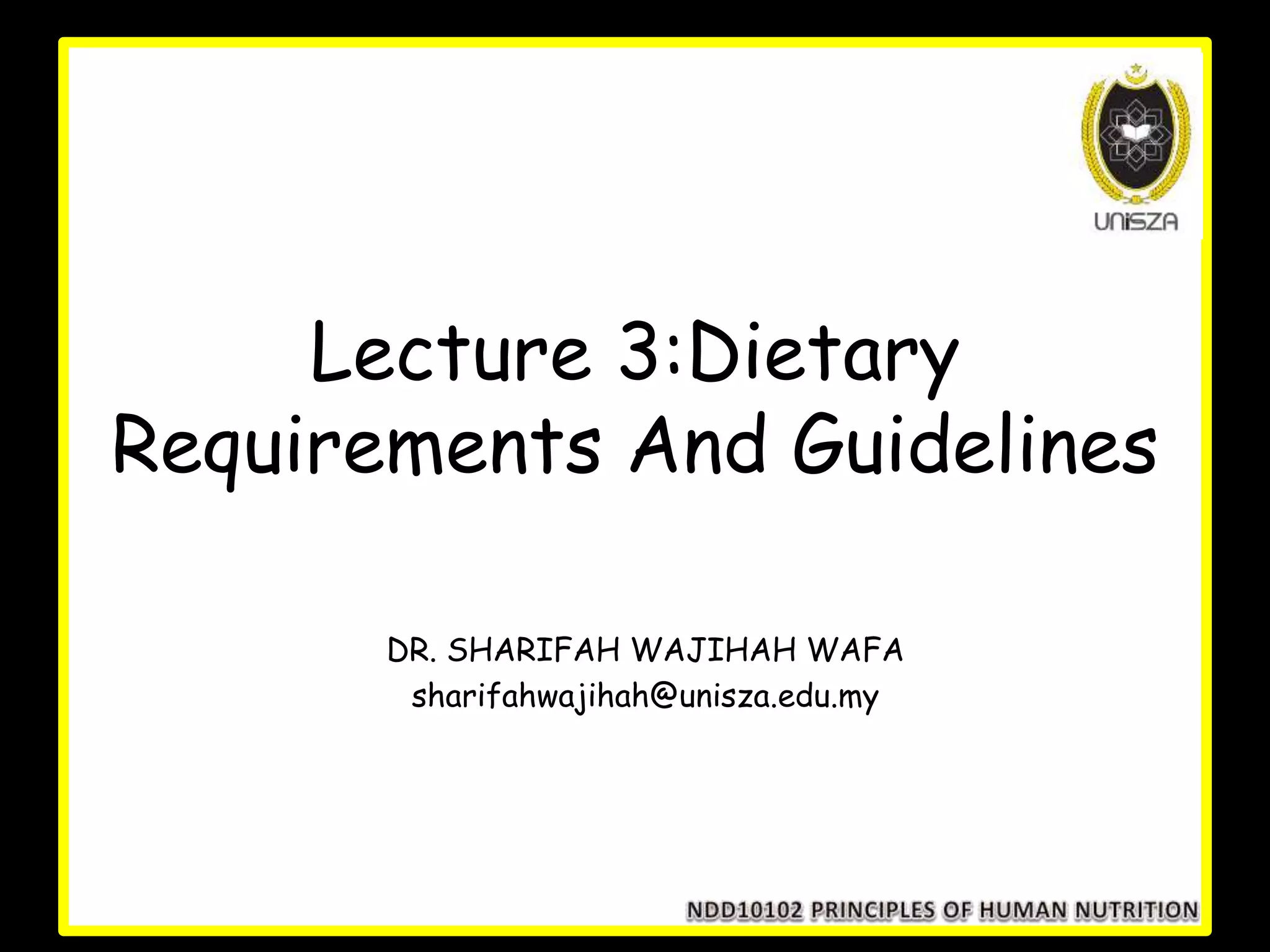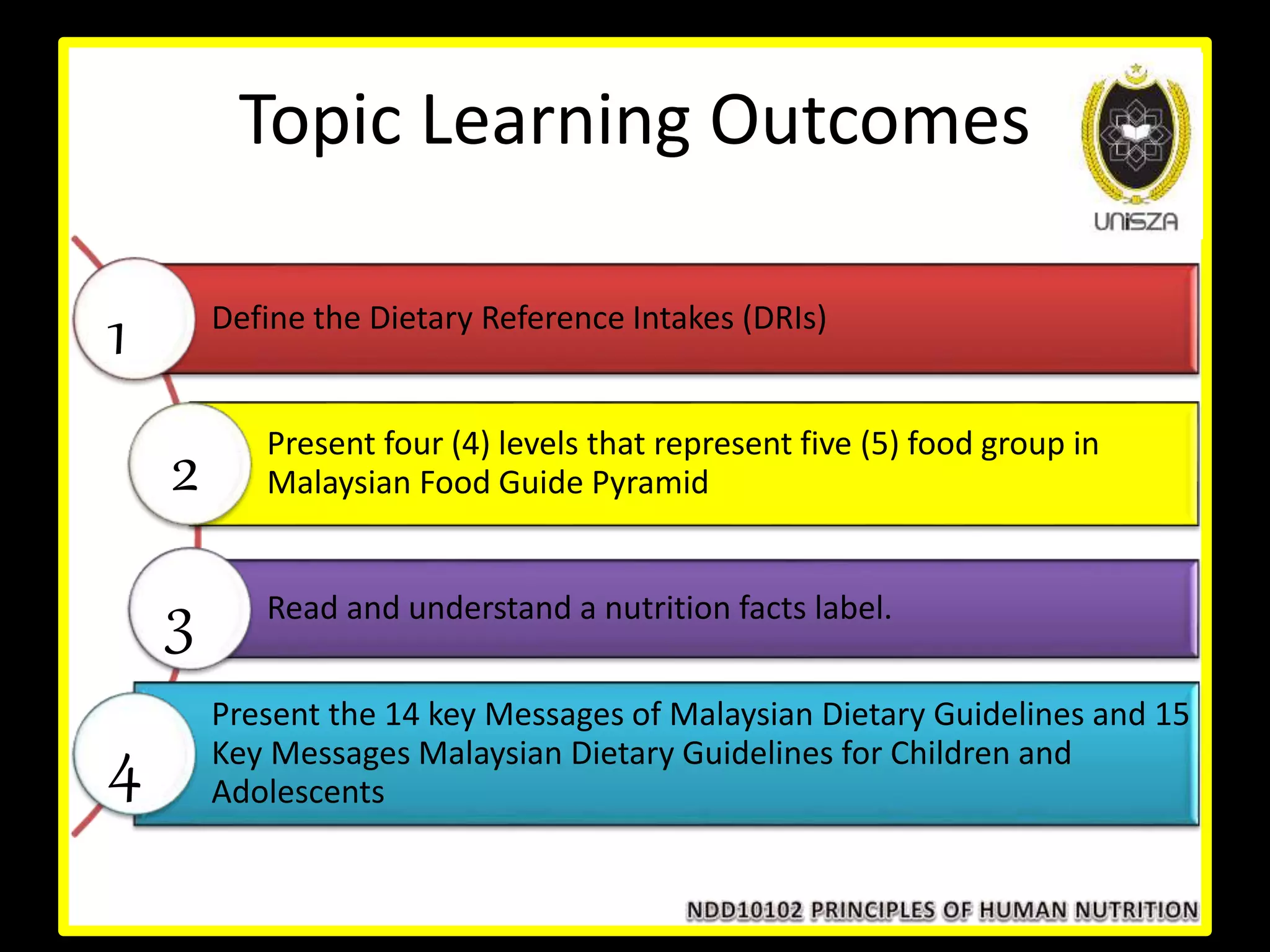 The document outlines dietary requirements and guidelines, focusing on the Dietary Reference Intakes (DRIs) that guide safe nutrient intake for healthy individuals. It presents components of the DRIs, such as Estimated Average Requirement (EAR), Recommended Dietary Allowance (RDA), and Tolerable Upper Intake Levels (UL), while also emphasizing the importance of a balanced diet through the Malaysian Food Guide Pyramid. Additionally, it discusses how to interpret nutrition labels to promote healthier food choices and highlights key messages from the Malaysian dietary guidelines.