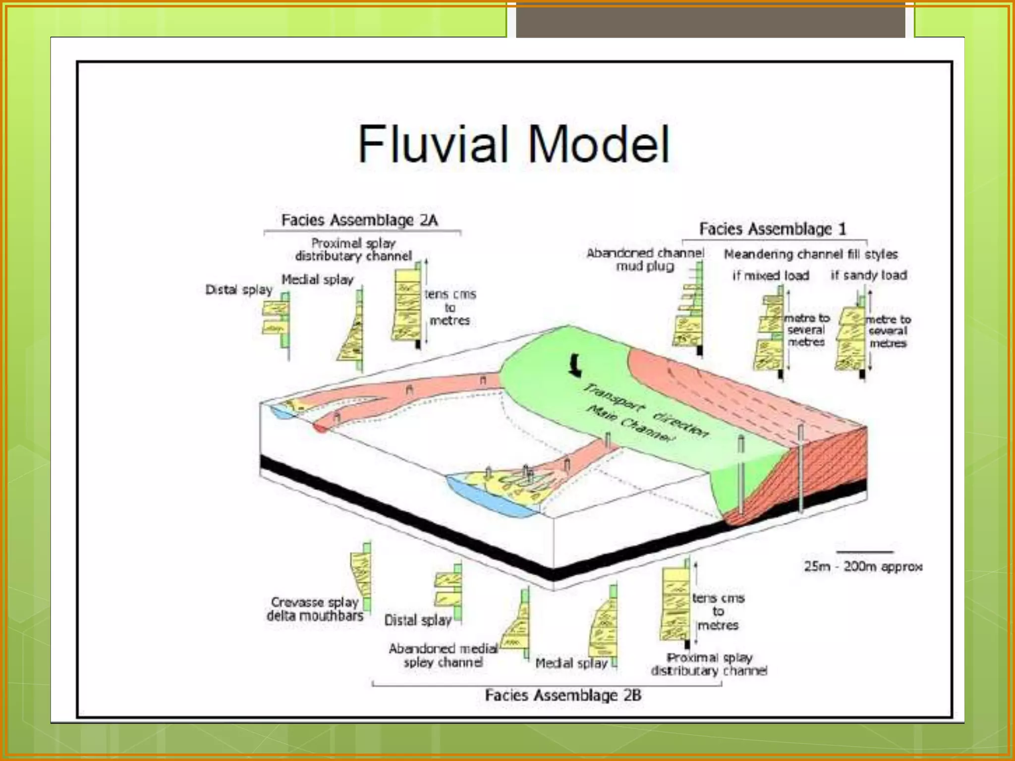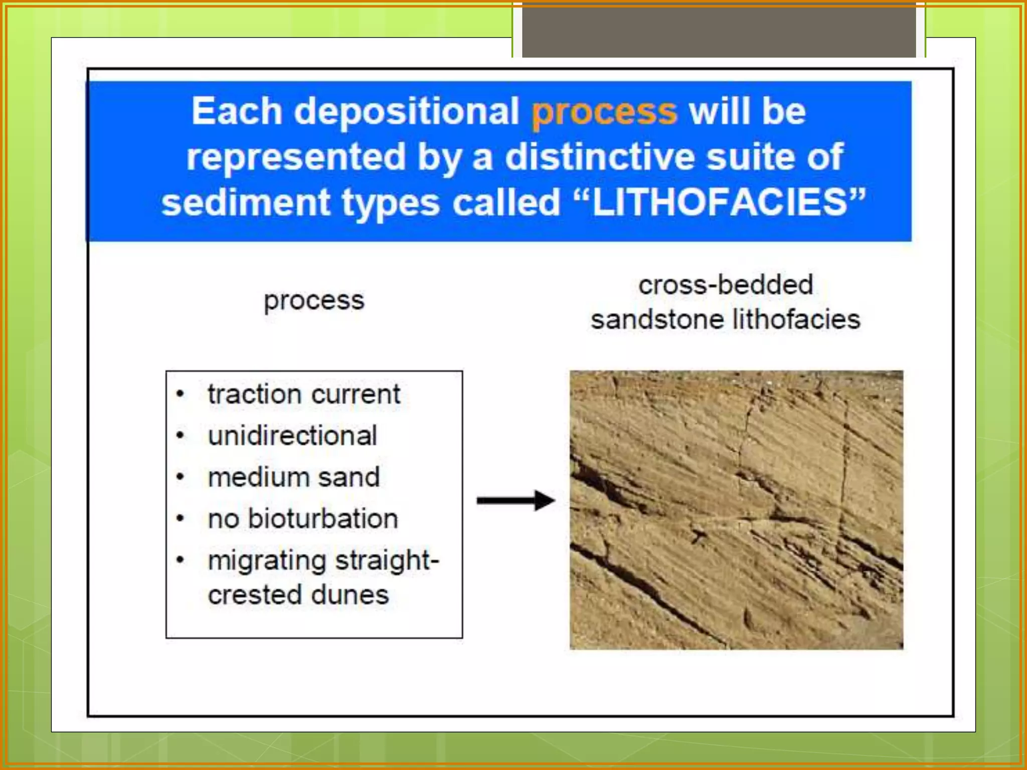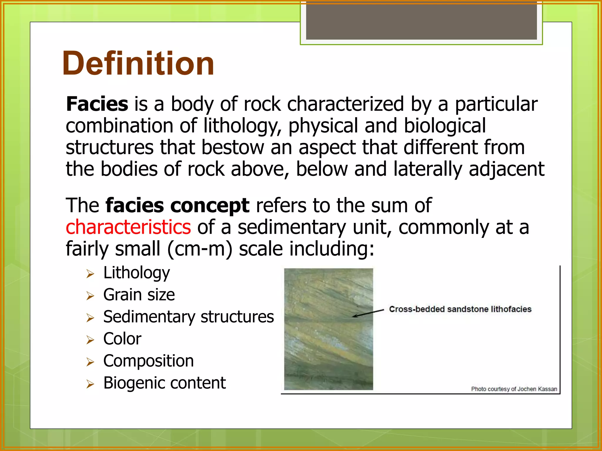 This document defines facies as a body of rock characterized by a particular combination of lithology, physical structures, and biological features that distinguish it from surrounding rock. Facies are determined at small scales based on characteristics like grain size, sedimentary structures, color, composition, and fossil content. Facies associations represent depositional environments through combinations of facies. Facies successions show progressive changes in properties that indicate lateral or vertical environmental changes. Facies analysis is used to interpret depositional environments and systems from rock characteristics.
