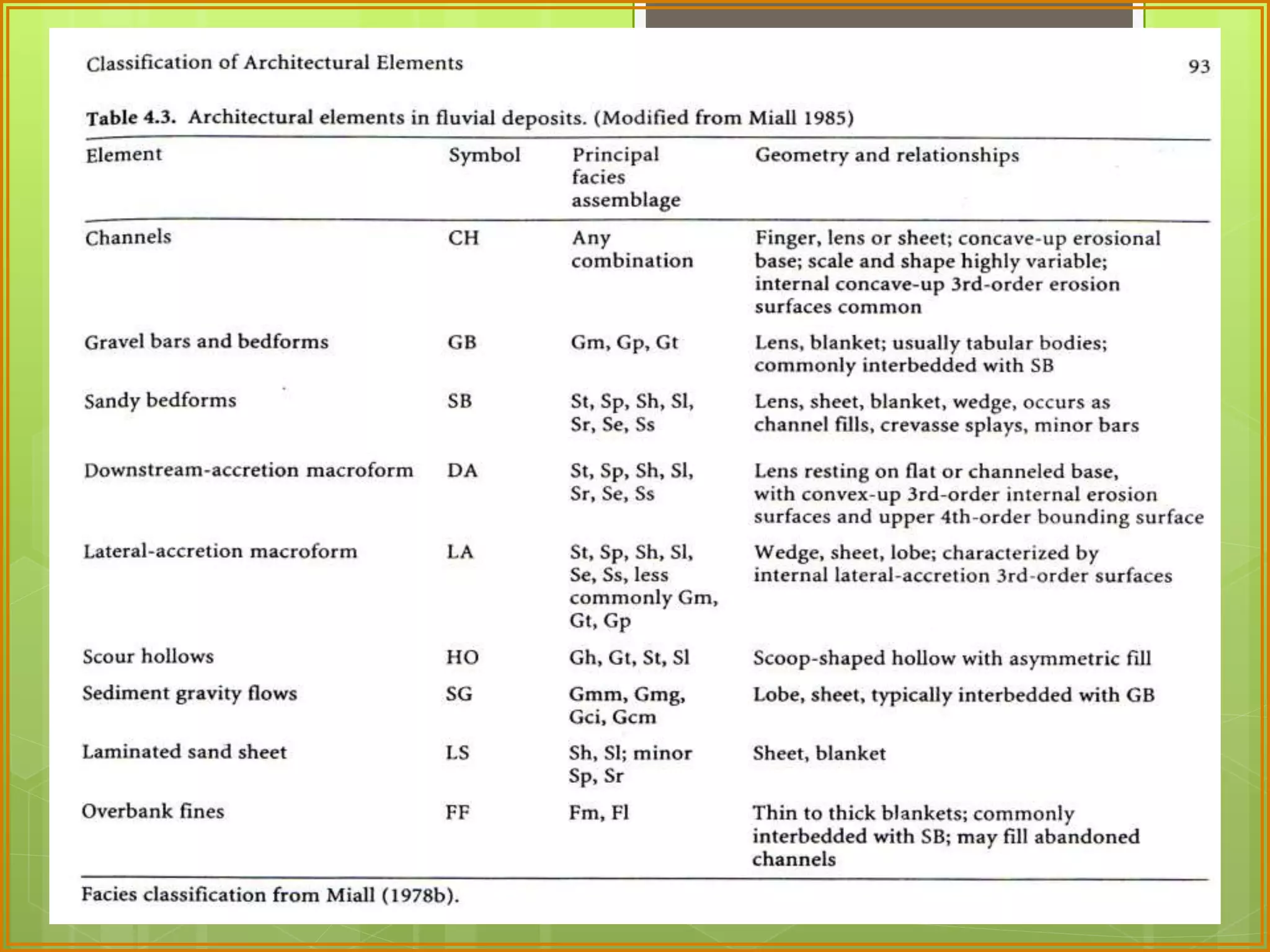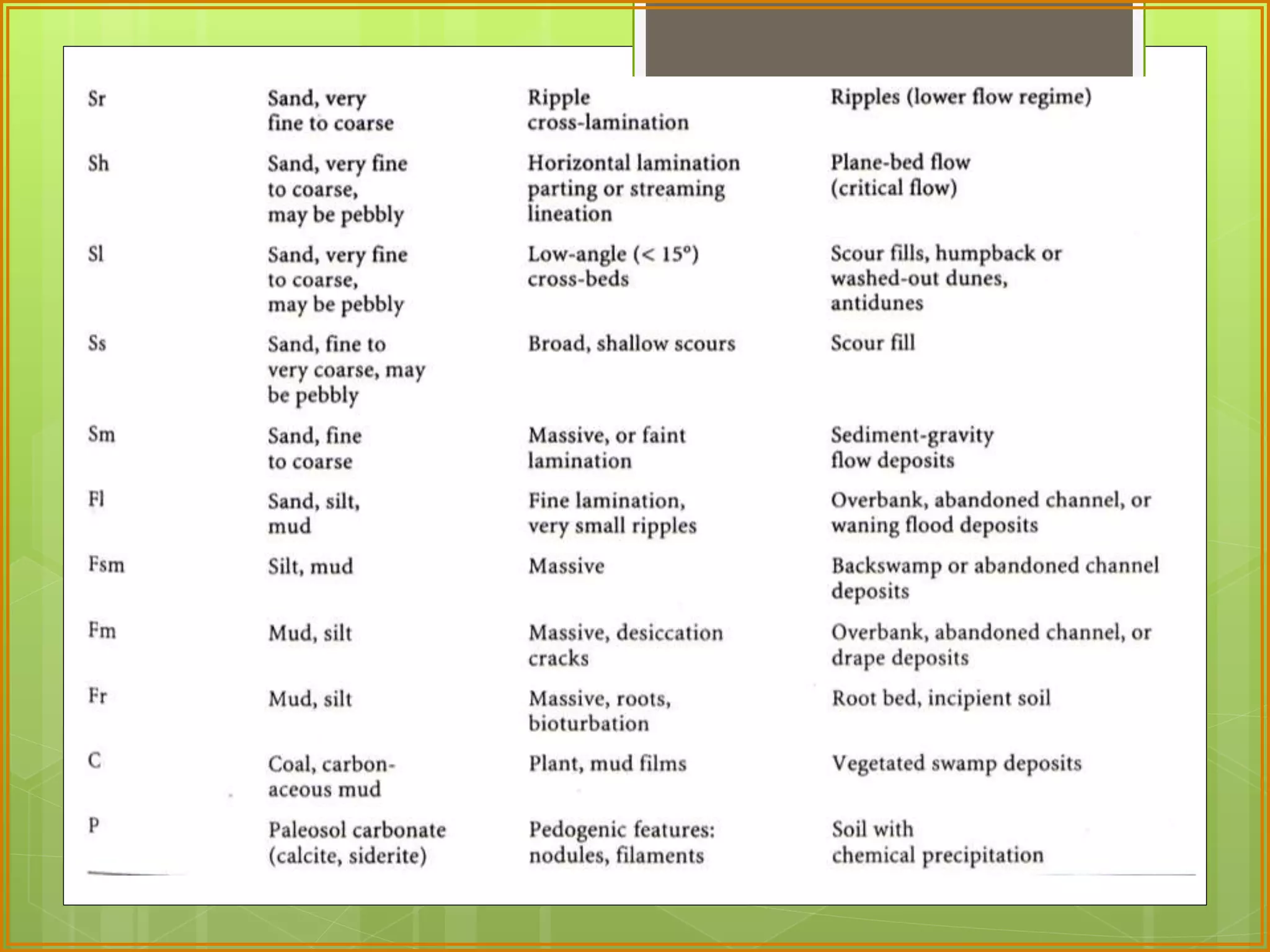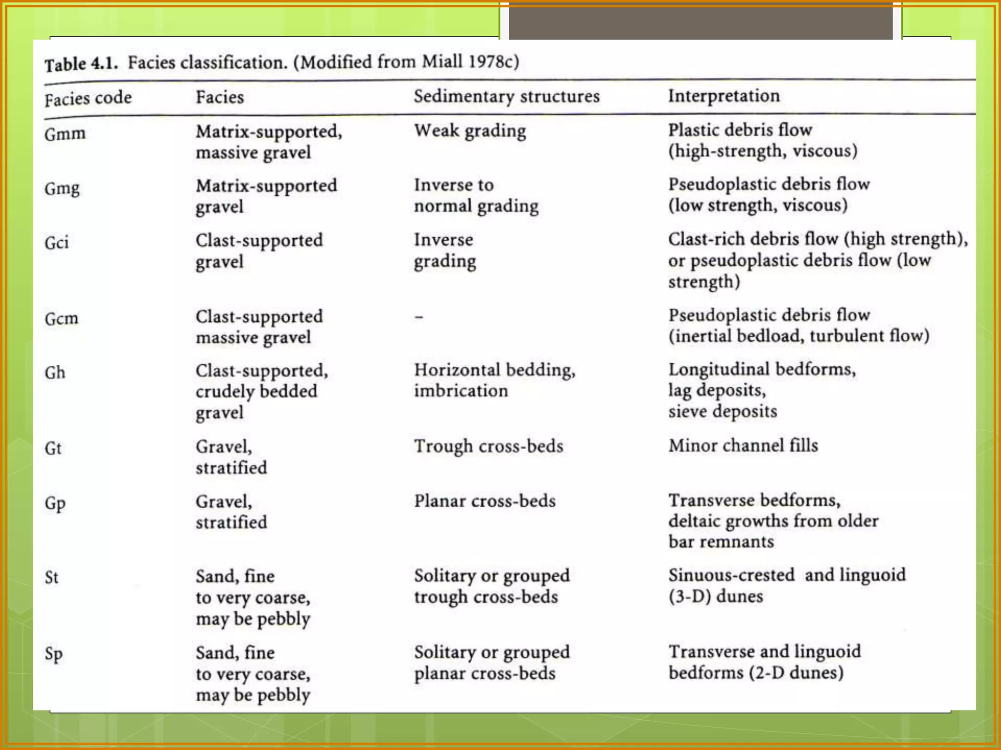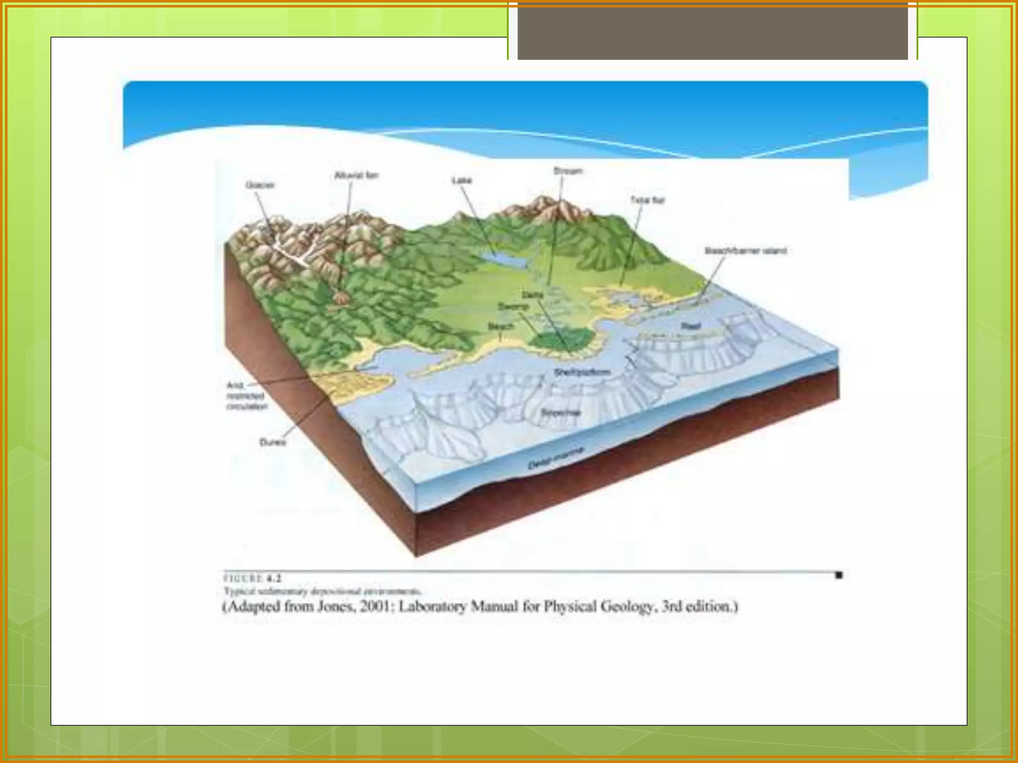 This document defines facies as a body of rock characterized by a particular combination of lithology, physical structures, and biological features that distinguish it from surrounding rock. Facies are determined at small scales based on characteristics like grain size, sedimentary structures, color, composition, and fossil content. Facies associations represent depositional environments through combinations of facies. Facies successions show progressive changes in properties that indicate lateral or vertical environmental changes. Facies analysis is used to interpret depositional environments and systems from rock characteristics.