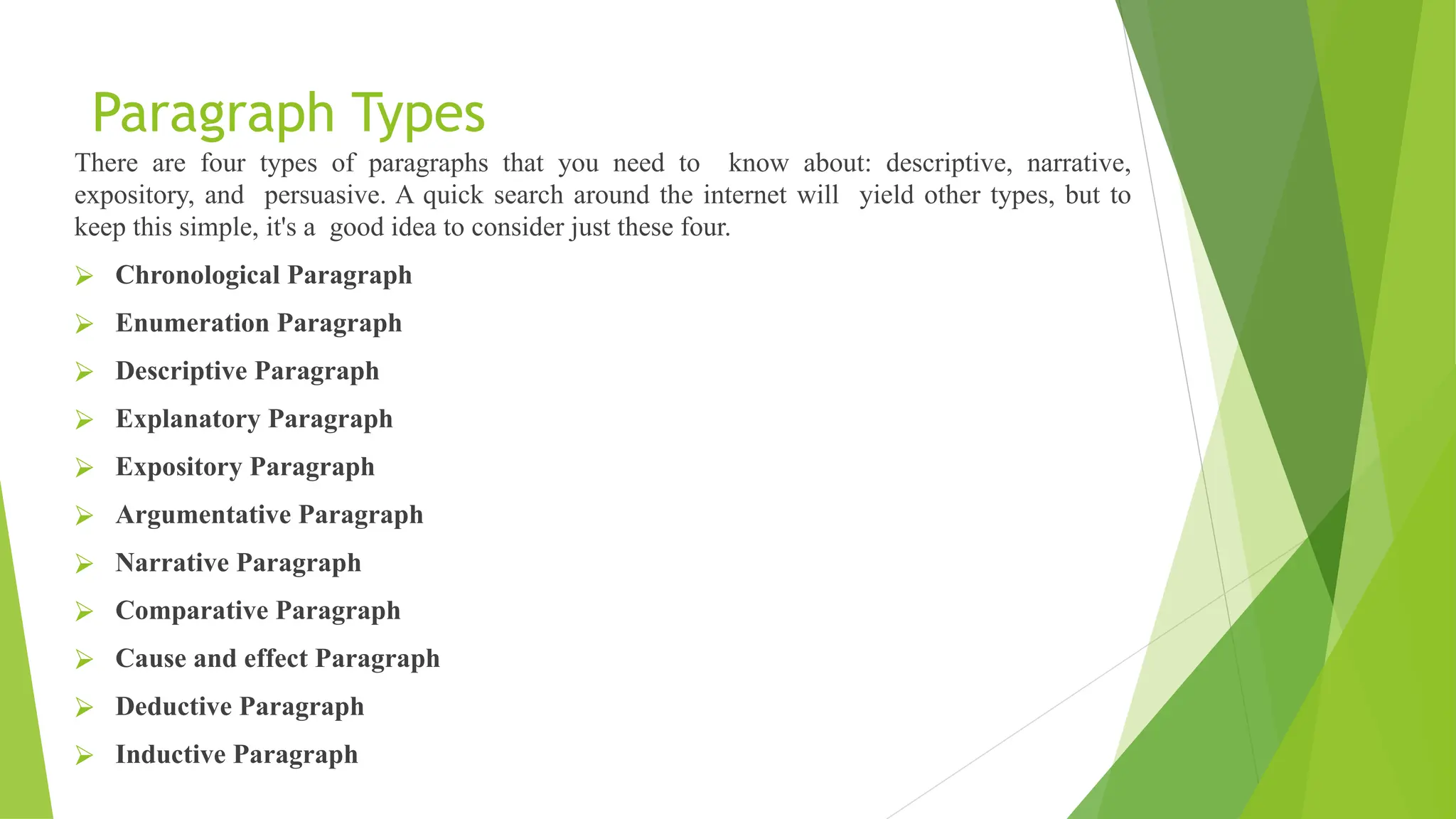 The document outlines four main types of paragraphs: descriptive, narrative, expository, and persuasive, with additional detailed explanations of various subtypes. It describes the purpose and structure of each type, emphasizing the use of transitional words in chronological and narrative paragraphs, the inclusion of sensory details in descriptive paragraphs, and the organization strategies for expository and argumentative paragraphs. The document also highlights comparative, cause and effect, deductive, and inductive paragraph structures, providing guidance for effective writing.