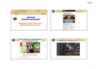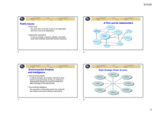 This document contains lecture notes on managing public issues and stakeholder relationships. It discusses key concepts like public issues, stakeholder expectations, environmental analysis, drivers of stakeholder engagement, and different stages of engagement from inactive to interactive. It provides examples to illustrate reactive, proactive, and interactive engagement approaches. Stakeholder analysis is discussed as identifying relevant stakeholders, their interests, power, and potential coalitions. The consequences of not engaging stakeholders and adopting strategic monitoring are also examined.