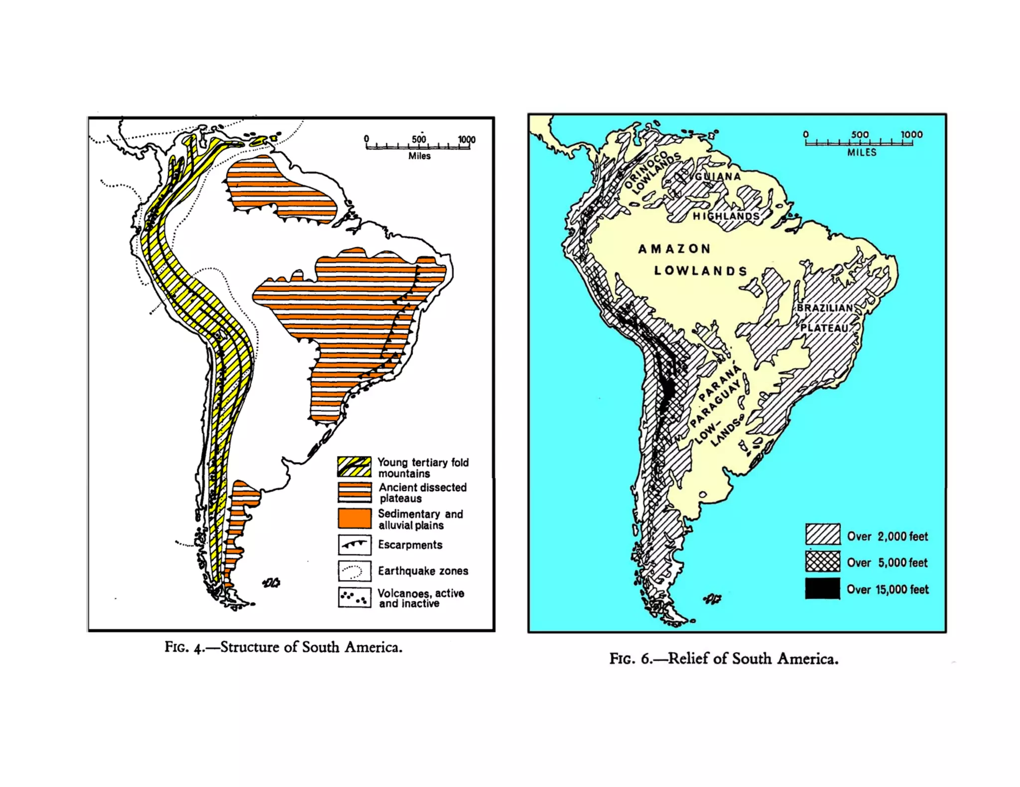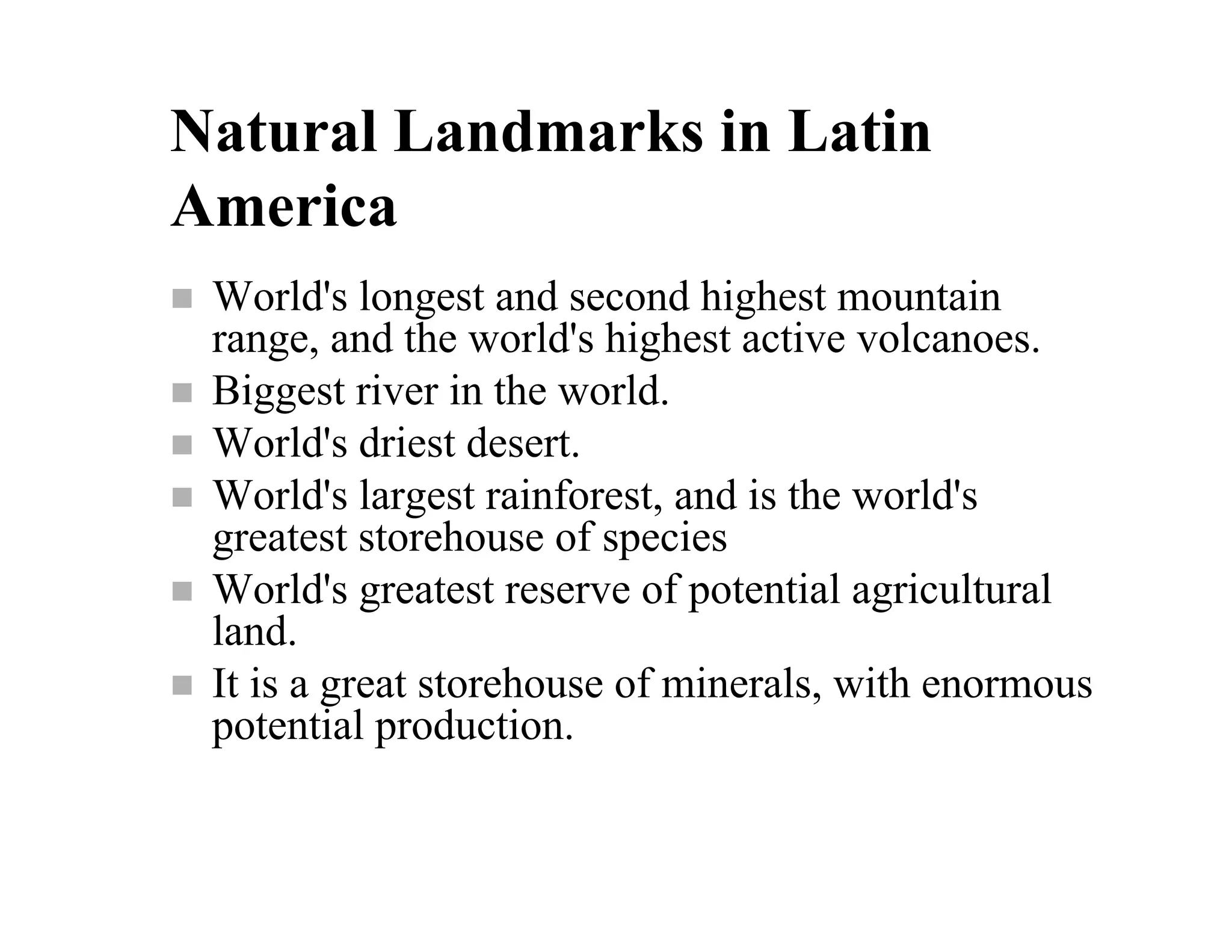 Latin America contains many notable physical landmarks including the longest mountain range in the world (the Andes), the world's highest volcanoes, largest rainforest (Amazon), and driest desert (Atacama). The climate of most of Latin America is tropical, with little seasonal temperature variation but distinct wet and dry seasons. Elevation strongly influences climate, with five altitudinal zones ranging from hot lowlands to cold mountain peaks. Major physical features include the Andes Mountains, Mexican plateau, Central American volcanic arc, and lowland river basins of the Amazon, Orinoco, and Rio de la Plata.