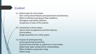 This document discusses different types of turbines used in micro hydro power systems, including their constructional features and operational characteristics. It covers impulse turbines like Pelton and Turgo turbines that are suitable for higher heads. It also discusses reaction turbines like cross-flow turbines that are used in lower head applications. The document provides details on selecting the appropriate turbine type using nomograms. It describes drive systems and speed governors. It also discusses part-flow efficiency and methods for sizing turbines based on site characteristics.