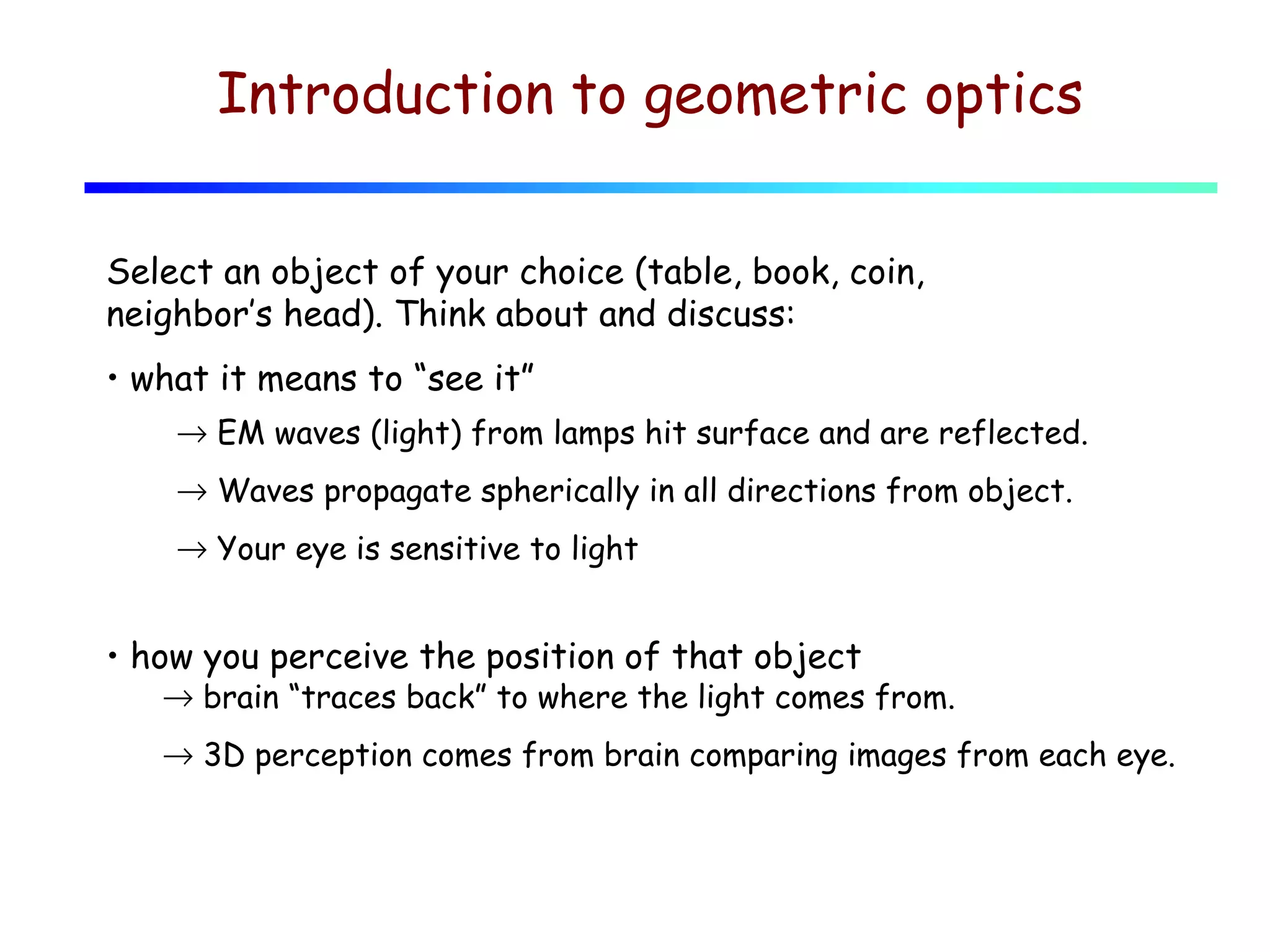 This document provides an introduction to geometric optics and concepts of reflection and refraction of light. It discusses how light rays interact with surfaces and change direction at boundaries between different optical media based on Snell's law. Total internal reflection is described, in which light reflecting back into the original medium if the angle of incidence is greater than the critical angle. Applications like fiber optics and mirages are discussed. A simple model is provided of light propagation through materials involving absorption and re-emission of photons by atoms.