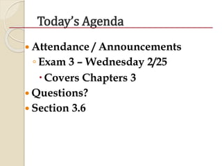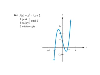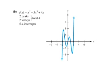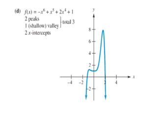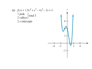 The document outlines an agenda for a class that includes: - An exam on Wednesday covering Chapter 3 - A discussion of Section 3.6 on polynomial functions of degrees 2, 4, and 5 - Examples of basic graphs of polynomials of degrees 3 and 4 - A discussion of end behavior and the number of peaks/valleys in polynomial graphs - A strategy for graphing polynomials that involves determining the degree, finding x-intercepts, y-intercepts, end behavior, and additional points to plot and sketch the graph