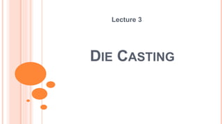 The document provides an overview of die casting, focusing on cold chamber and hot chamber processes used with various metal alloys such as aluminum, brass, magnesium, zinc, tin, and lead. It details the advantages and disadvantages of die casting, including production rates, part complexity, and potential defects during the casting process. Additionally, it highlights the application of die casting in manufacturing engine components and other mechanical parts.