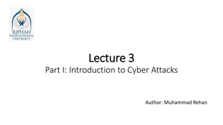 This document provides an overview of various cyber attacks, including malware attacks, phishing, password attacks, man-in-the-middle attacks, SQL injection, denial-of-service attacks, insider threats, cryptojacking, zero-day exploits, and watering hole attacks. For each type of attack, the document discusses how the attack works and recommendations for prevention, such as using antivirus software, strong passwords, encryption, firewalls, intrusion detection, and limiting access privileges. The document also outlines the four stages of a computer virus: dormant, propagation, triggering, and execution.