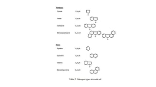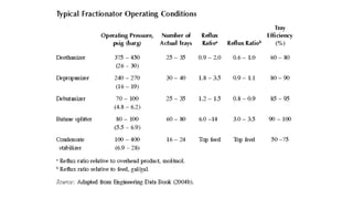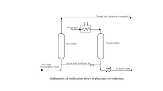 The document discusses sweetening processes in petroleum refining and mooring systems for offshore platforms. It describes how sweetening removes contaminants from petroleum streams like sulfur compounds and metals. Common sweetening methods include sulfuric acid treating, clay treating, and caustic treating. It also explains typical equipment used like absorbers, flash drums, and regenerative solvent systems. For mooring systems, it compares chain, wire, and synthetic fiber lines and discusses design considerations for deepwater applications like reduced line length and restoring forces from line stretch rather than catenary shape.