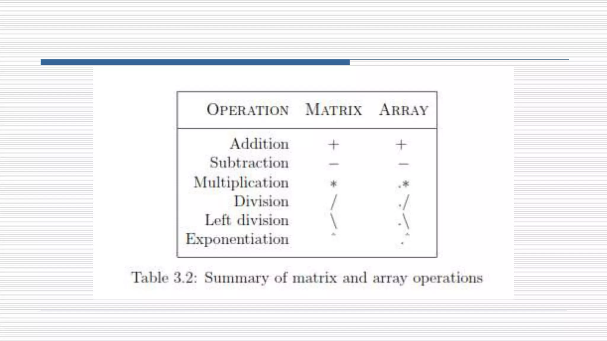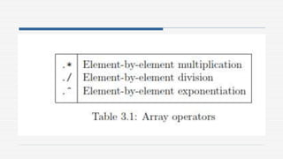 The document discusses entering matrices in MATLAB. It explains that a matrix is entered using square brackets with elements separated by spaces or commas within each row and semicolons between rows. Once entered, the matrix is stored in the workspace. It also describes how to find specific elements of a matrix, extract submatrices, determine matrix dimensions, transpose a matrix, concatenate matrices, and perform basic arithmetic operations on matrices.