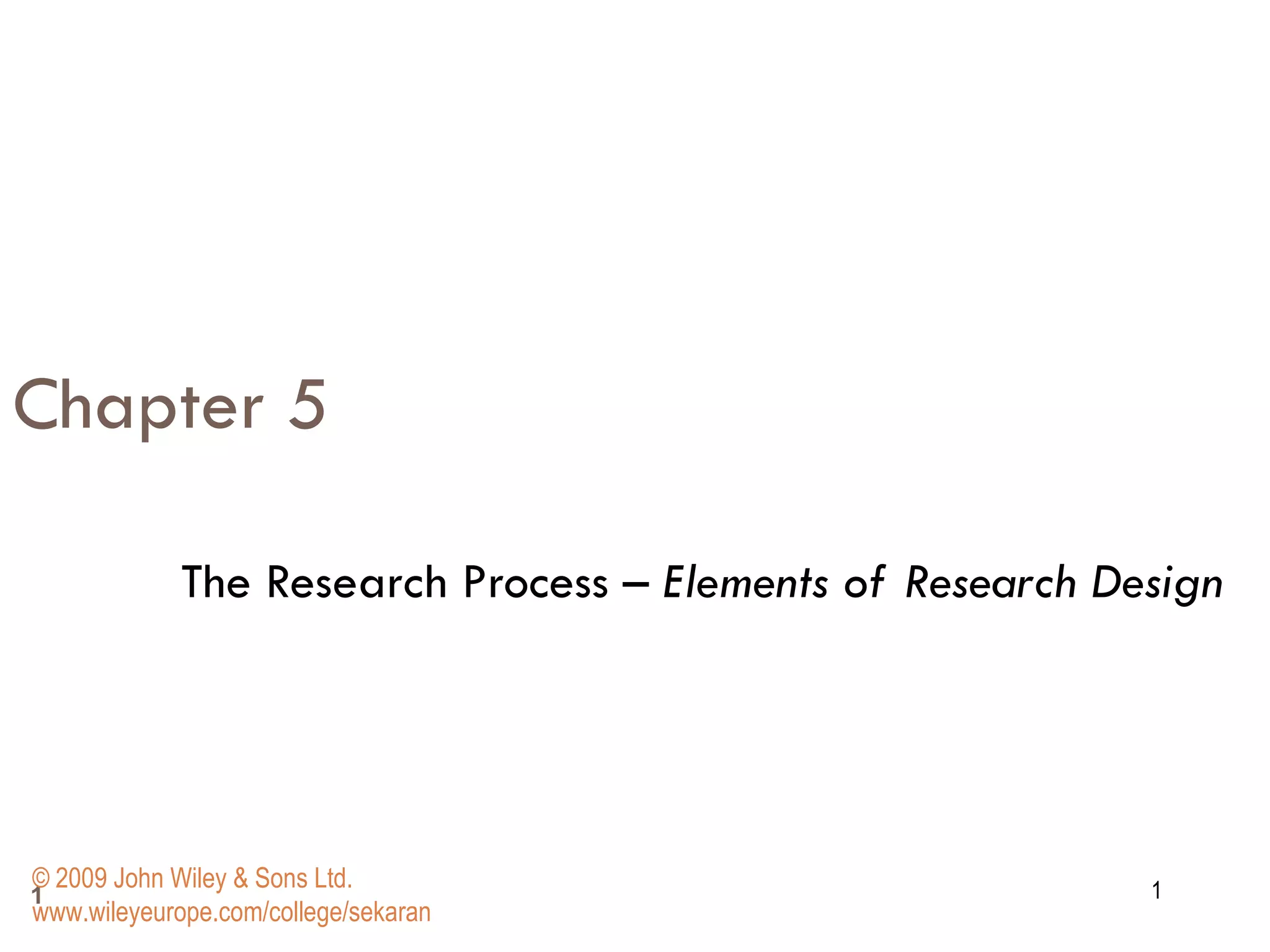 The document discusses key elements of research design including the purpose of studies, types of investigations, study settings, populations, time horizons, and units of analysis. It also covers measurement scales, reliability, and validity. The purpose can be exploratory, descriptive, or for hypothesis testing. Studies can be causal, correlational, contrived or non-contrived. Populations can be individuals, groups, organizations or cultures. Studies can also be cross-sectional or longitudinal. Proper research design ensures the purpose is effectively addressed.