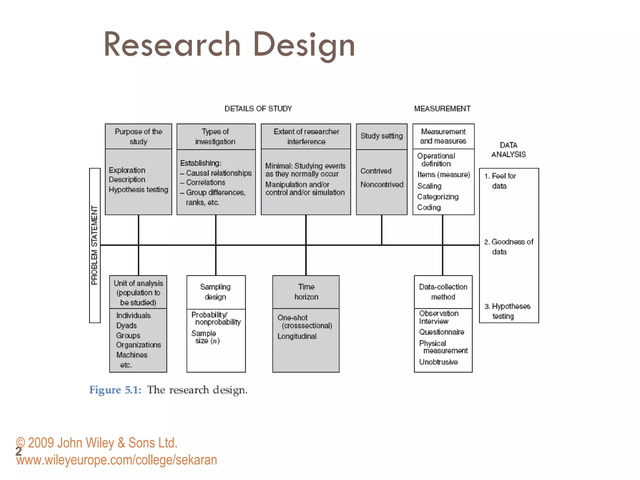 The document discusses key elements of research design including the purpose of studies, types of investigations, study settings, populations, time horizons, and units of analysis. It also covers measurement scales, reliability, and validity. The purpose of research design is to ensure the study effectively addresses its goals. Considering these elements early helps avoid issues later in the research process.