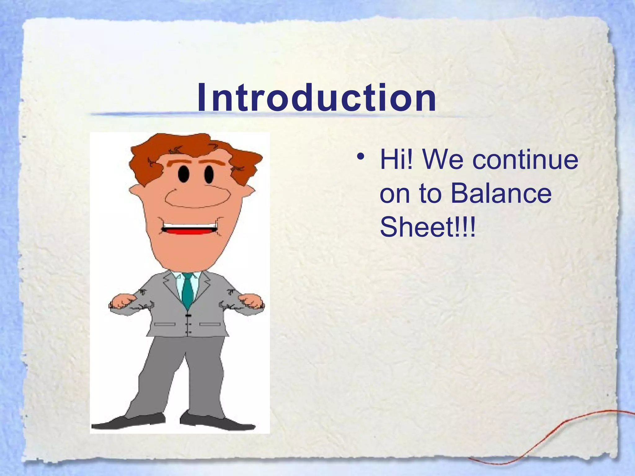 - A balance sheet is a financial statement that lists a business's assets, liabilities, and equity at a point in time. It provides a snapshot of what the business owns and owes.