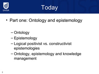 It explains that ontology is the study of what exists, while epistemology is the study of how knowledge is acquired and what can be known. There are two main epistemological perspectives - logical positivism which sees knowledge as objectively reflecting reality, and constructivism which sees knowledge as personally constructed.