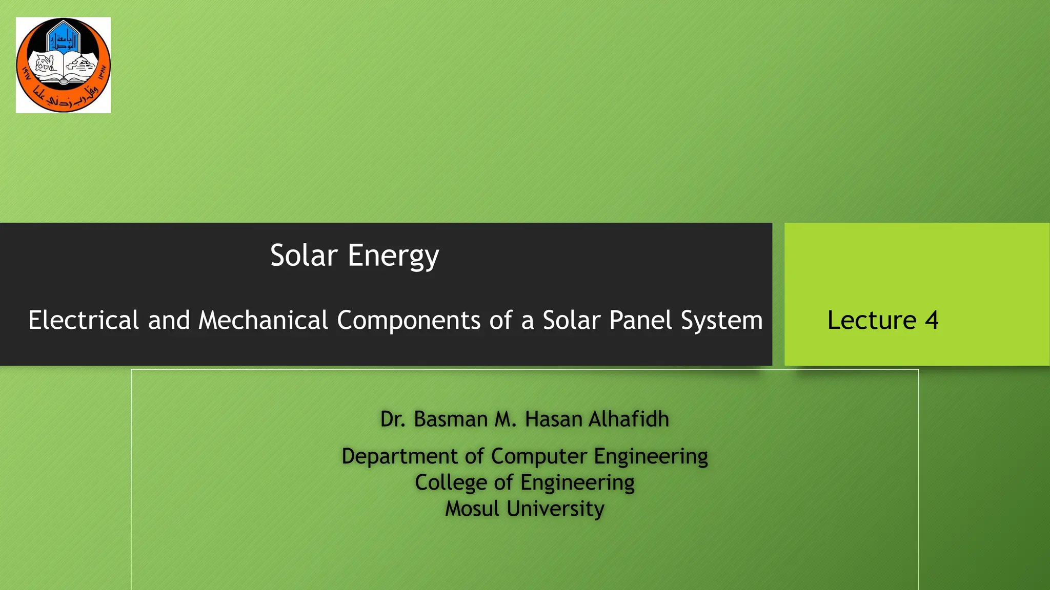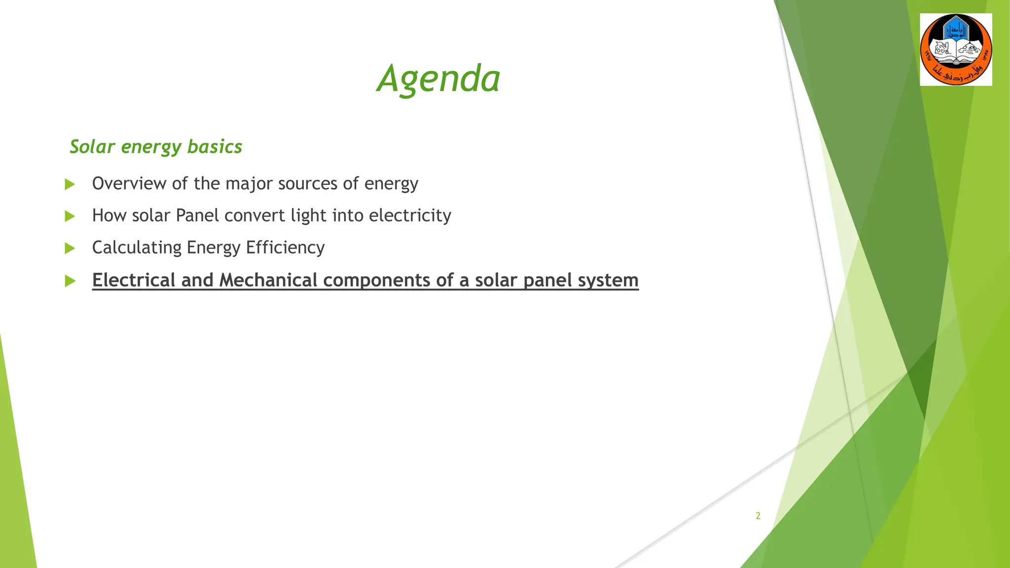 The document discusses the electrical and mechanical components of a solar panel system. It identifies the major photovoltaic components as the solar panel, inverter, battery, and charge controller. The inverter converts the direct current from the solar panels to alternating current used in homes. Other components include the mounting system that attaches the solar panels to the roof or ground, wiring that connects all the parts, and electrical protections required by code. Proper installation of both the electrical and mechanical components is needed to safely implement a functioning solar energy system.