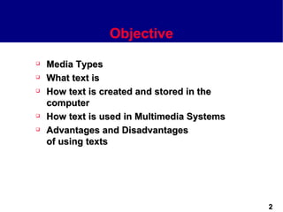Text is a key component in multimedia used to explain concepts, guide users, and provide information. It comes in various formats like plain, rich, and hypertext. Text has both temporal and non-temporal properties and can be customized through font type, size, style, and other characteristics to enhance readability and the user experience. While text is effective at communicating ideas, it requires more attention than other media. Antialiasing improves text appearance by reducing jagged pixel edges.