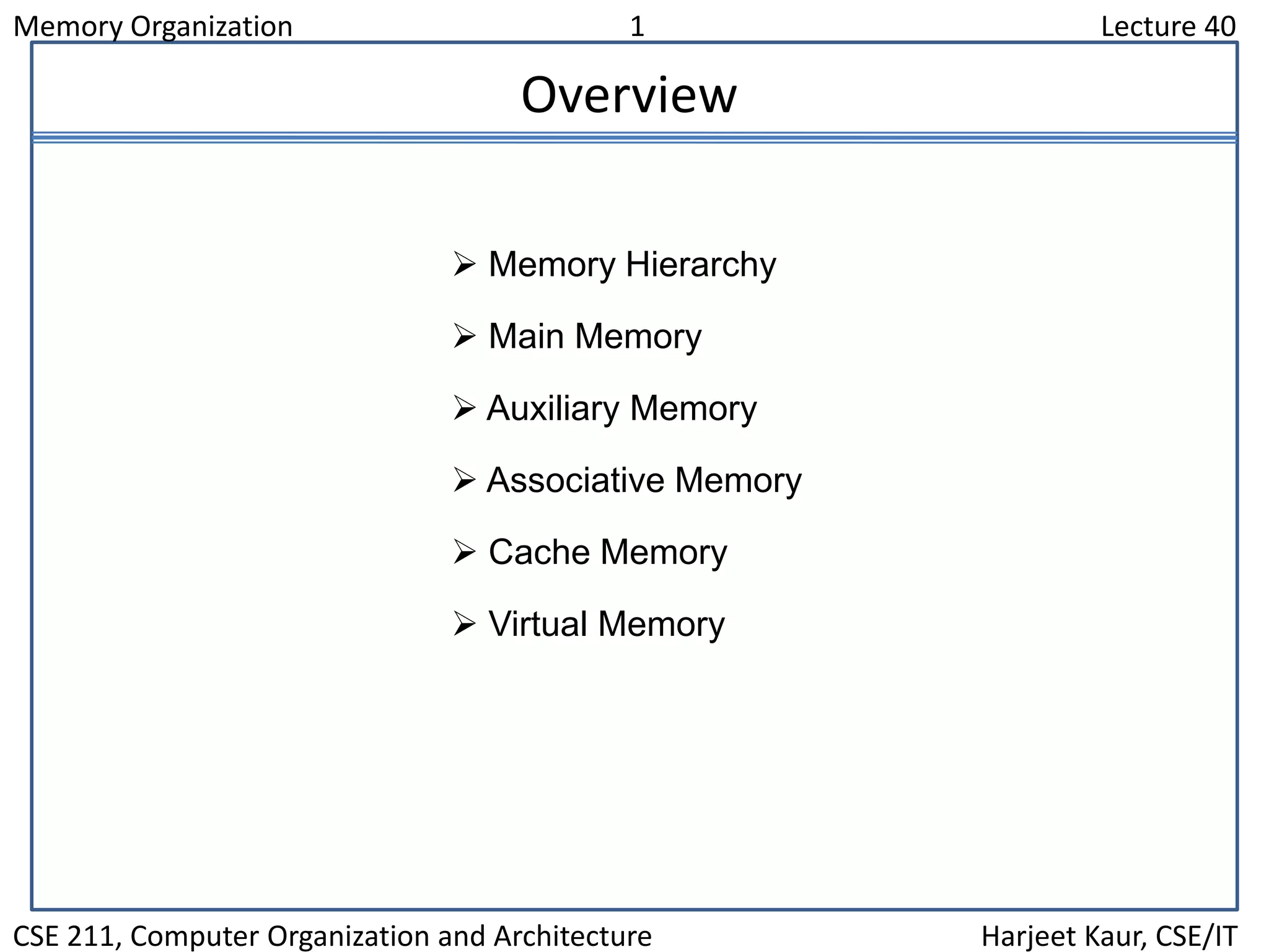 The document discusses computer memory organization. It describes the memory hierarchy from fastest to slowest as registers, cache memory, main memory, and auxiliary memory such as magnetic disks and tapes. The main memory section explains RAM and ROM chips, how they are connected to the CPU via address and data buses, and how the address lines select individual bytes or chips. It provides an example memory map assigning address ranges to different RAM and ROM chips and shows how a decoder chip selects the appropriate chip.