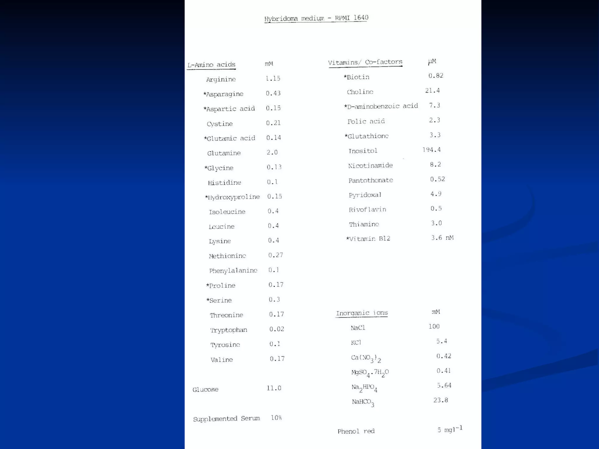 The document discusses various components of typical cell culture media, including carbohydrates, amino acids, salts, buffers, vitamins and hormones, antibiotics, and serum. It describes the purposes and considerations for each component in maintaining optimal cell growth conditions and metabolism. Key factors include maintaining isotonicity, buffering pH, providing nutrients and growth factors, and preventing bacterial/fungal contamination.