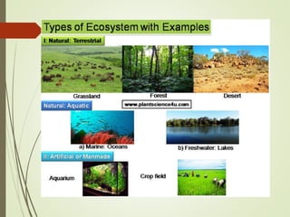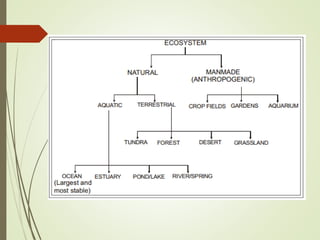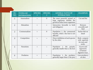 The document provides information about ecology and ecosystems. It defines ecology as the scientific study of the interactions between organisms and their environment. It then describes the key components of an ecosystem, including biotic components like producers, consumers, decomposers and abiotic components like climate, inorganic substances, and organic compounds. It explains the functions of ecosystems, including energy flow and nutrient cycling. It also discusses the various types of interactions between organisms in an ecosystem, such as positive interactions like mutualism and negative interactions like competition, predation, parasitism, and antibiosis.