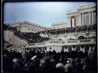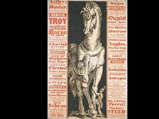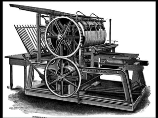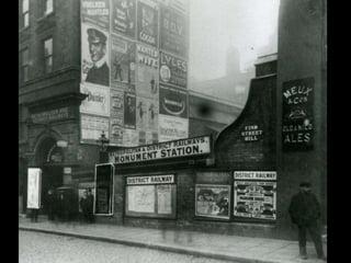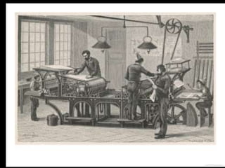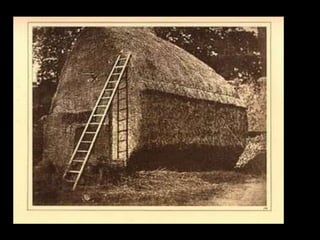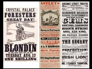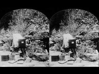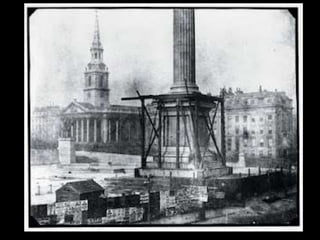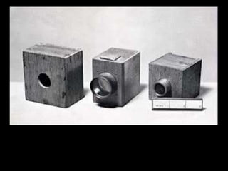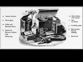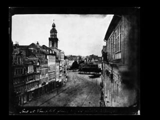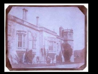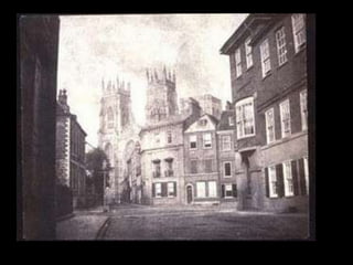 This document discusses early photographic techniques including advertising posters from the period, magazine covers, calotypes developed by Talbot in 1841 which used light-sensitive paper to create the first photographic negatives, allowing images to be reproduced, and the development of photography from daguerrotypes in 1837 which could not be reproduced to advances like glass plate negatives and eventually negative film by George Eastman in 1888.