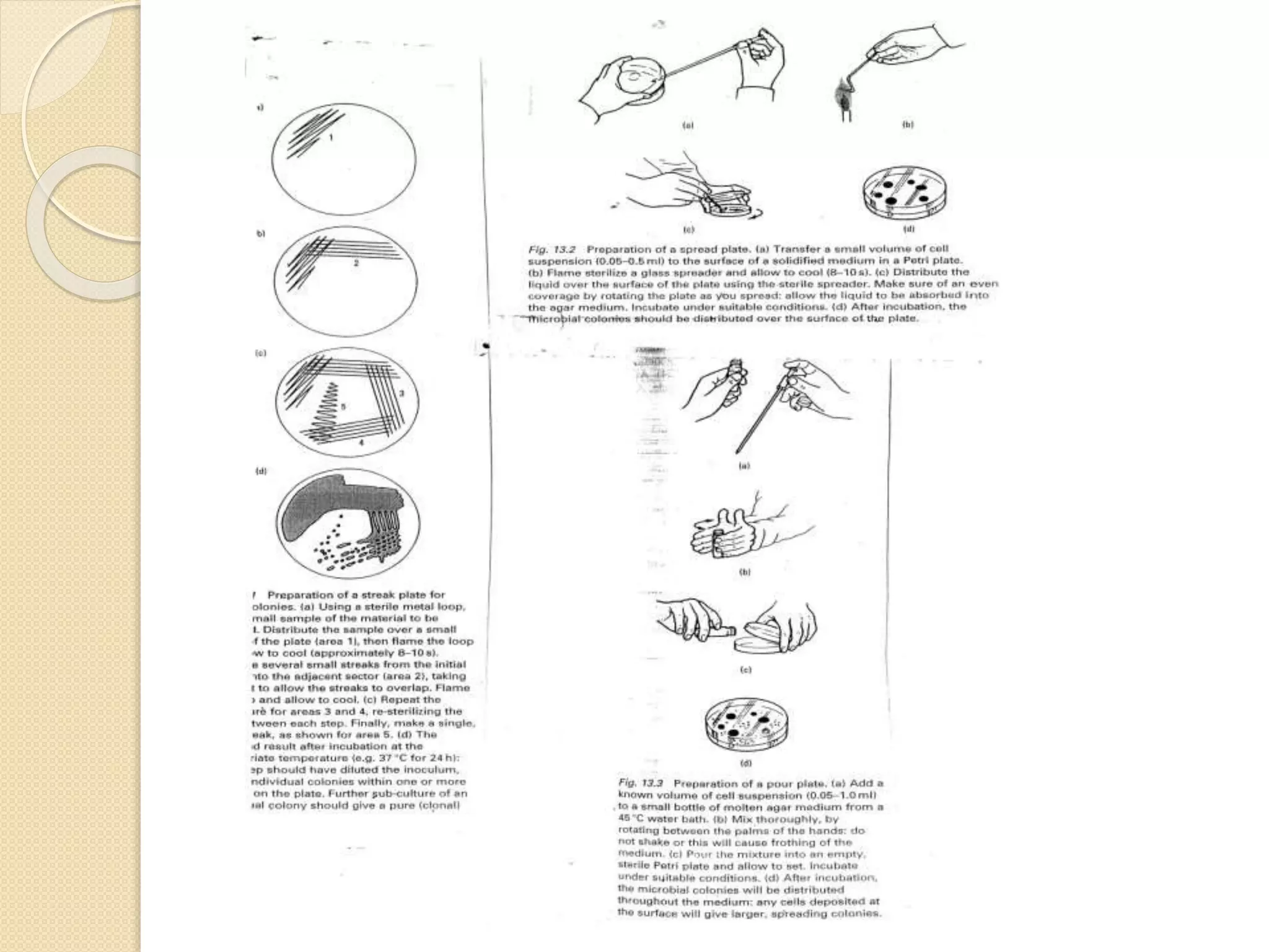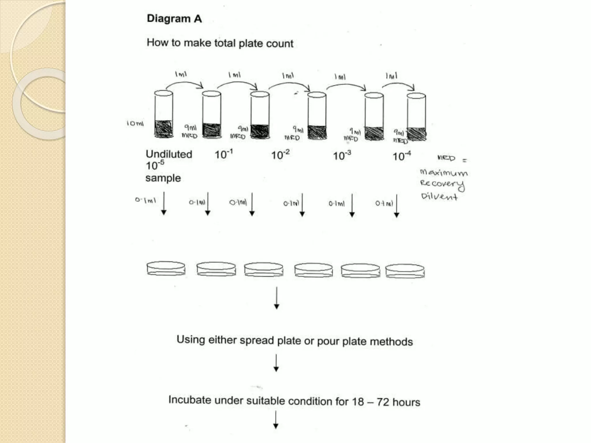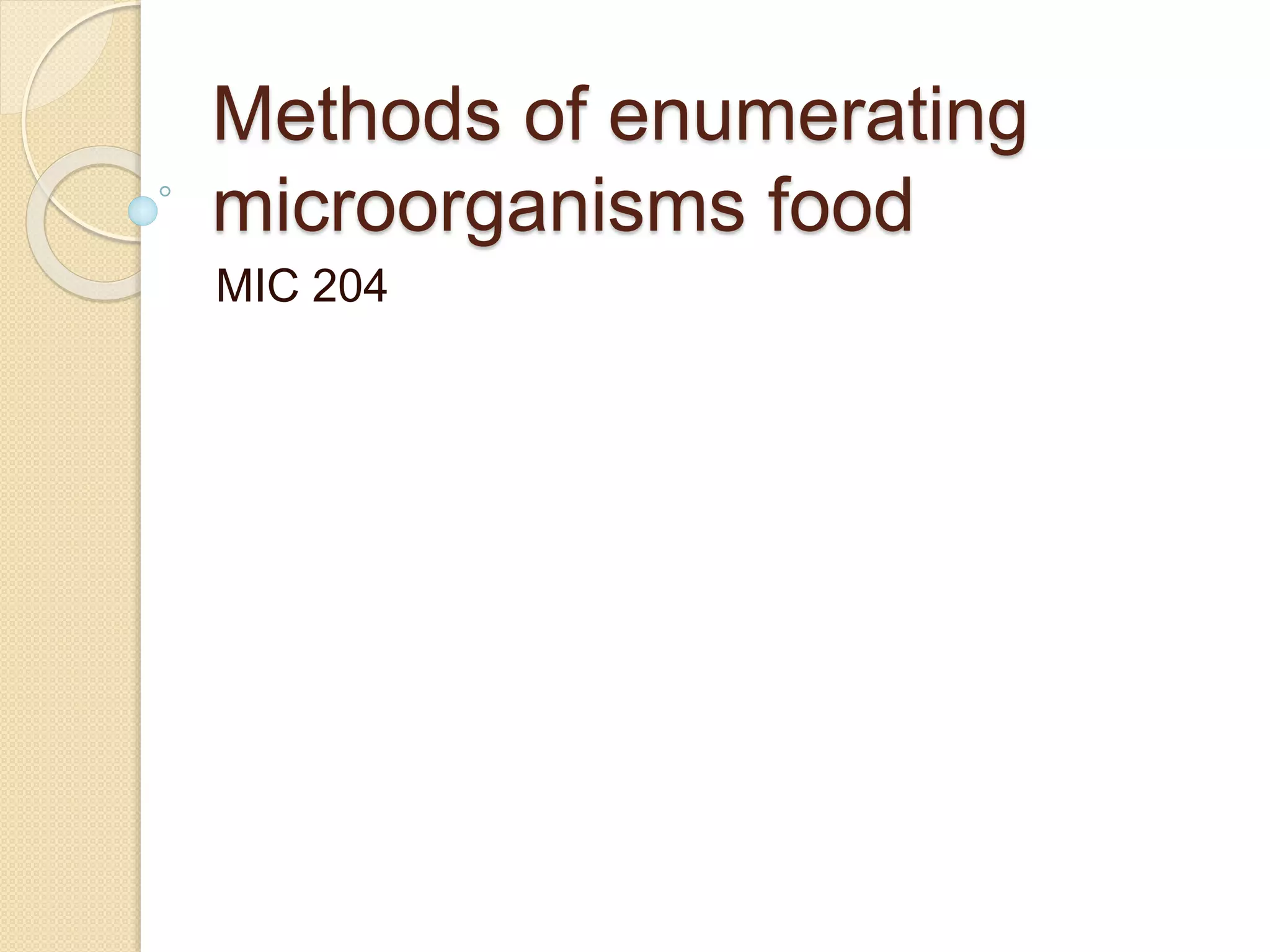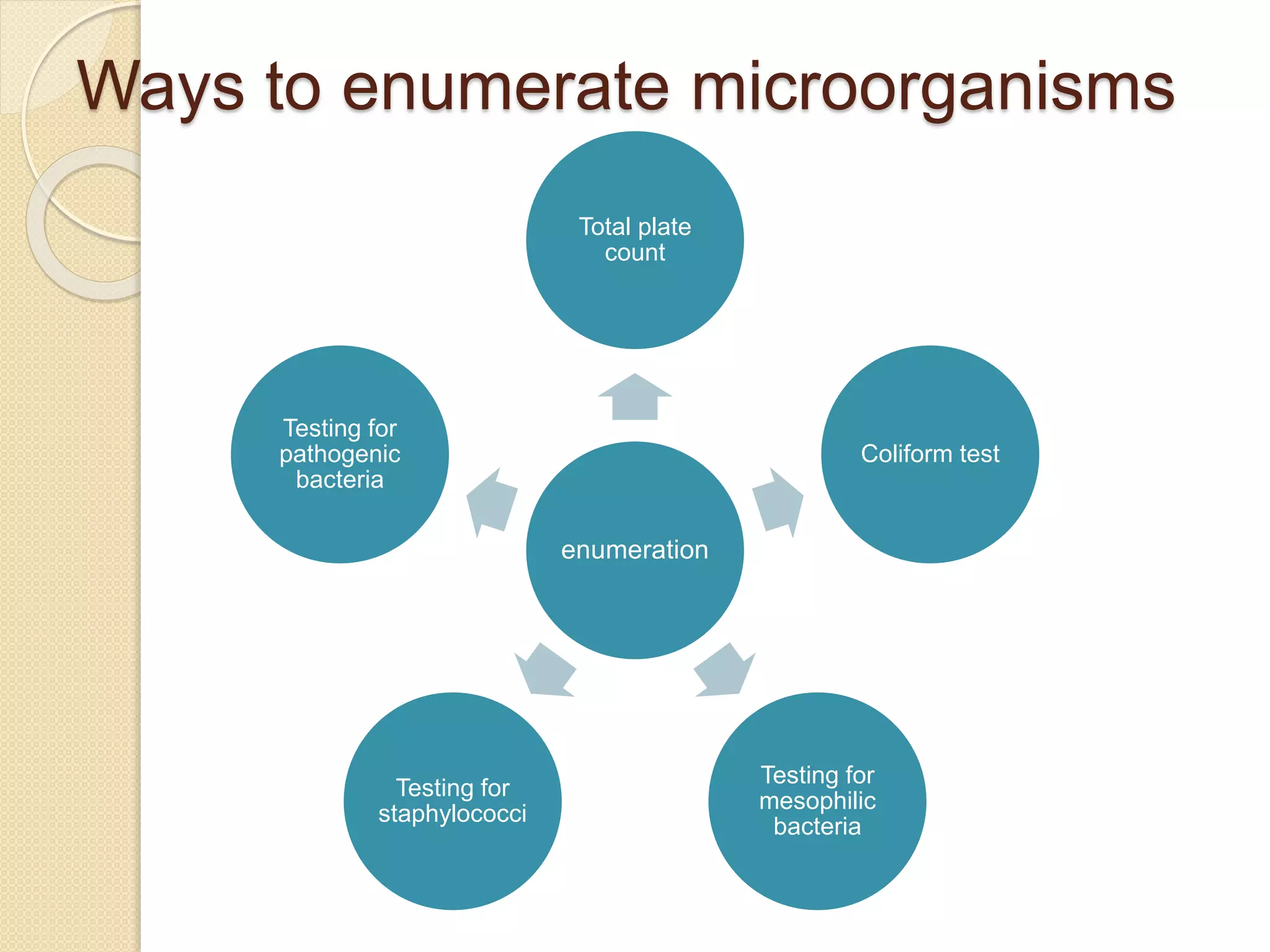 This document discusses various methods for enumerating and testing for microorganisms in food. It describes total plate counts, coliform tests, and tests for mesophilic bacteria, staphylococci, Salmonella, Shigella, and other pathogenic bacteria. Specific procedures are outlined, including enrichment, plating, screening, and confirmation steps. A variety of media are used, such as violet red bile agar, Baird-Parker agar, triple sugar iron agar, and lysine iron agar. Colonies are examined for characteristics like color, zone formation, and biochemical reactions to identify microorganisms.