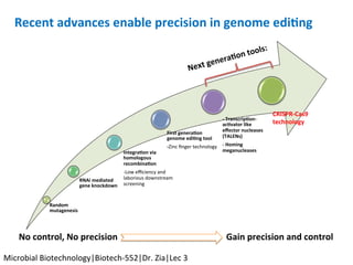 The document discusses the CRISPR-Cas9 system and its use as a genome editing tool. It provides background on the discovery of CRISPRs in bacteria and archaea. It describes the mechanism of CRISPR-Cas9 resistance, including adaptation, expression and interference stages. It discusses the components of CRISPR-Cas9 including the guide RNA and Cas9 nuclease domains. It also covers the protospacer adjacent motif (PAM) sequence, DNA repair pathways used, applications of nickase systems and multiplex genome engineering with CRISPR.