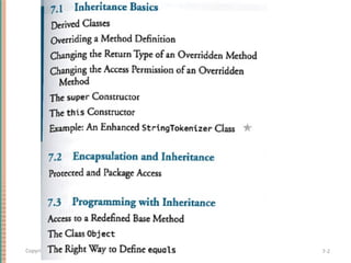 This document discusses inheritance in object-oriented programming and Java. It introduces inheritance as a technique where a derived class inherits attributes and behaviors from a base class. A derived class automatically has all instance variables and methods of the base class. The document provides examples of how to define derived classes in Java that extend and override methods from a base class. It also discusses concepts like final classes that cannot be inherited from, and using the super constructor to initialize inherited attributes.