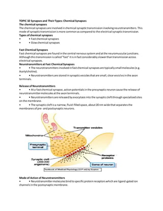 There are two main types of synapses: electrical and chemical. Electrical synapses allow direct electrical transmission between neurons through gap junctions, making them much faster than chemical synapses but also less common. Chemical synapses rely on neurotransmitters and are the main type of synaptic transmission. Neurotransmitters can be small molecules like acetylcholine for fast synaptic transmission, or larger molecules like peptides for slower synaptic transmission. A single neuron can use both electrical and chemical synapses.