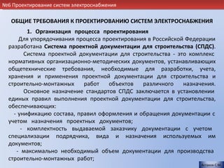 Документ посвящен проектированию систем электроснабжения и описывает общие требования, стандарты проектной документации, а также этапы проектирования, включая разработку технического задания, эскизного и рабочего проекта. Также рассматриваются взаимосвязи с унифицированными системами документации и требования к качеству проектных документов для обеспечения безопасности и эффективности. В заключении приведены правила подачи заявок на технологическое присоединение к электрическим сетям и спецификации для различных категорий потребителей.