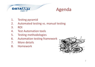1. The presenter provides an introduction and agenda which includes discussing the testing pyramid, automated vs manual testing, return on investment for test automation, and popular test automation tools.