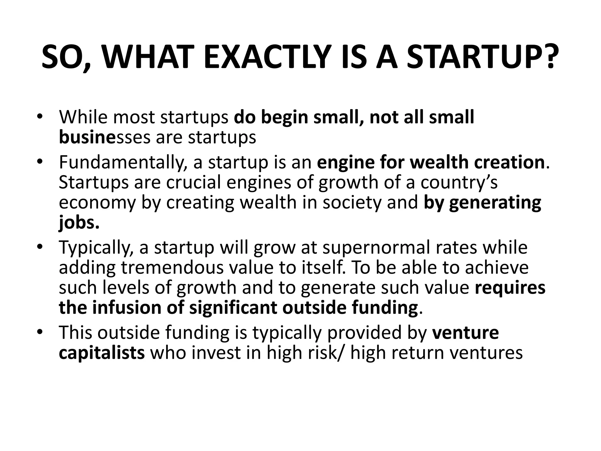 The document provides an overview of what constitutes a startup business versus a small business. It explains that startups require significant funding to achieve high growth rates and add value through generating jobs and wealth. The key aspects of a startup that it outlines are the need for a team-driven approach, appetite for risk-taking, and focusing business plans for investors on the team and market opportunity rather than extensive details. It also summarizes how venture capital firms operate by collecting funds from investors to invest in startups.