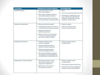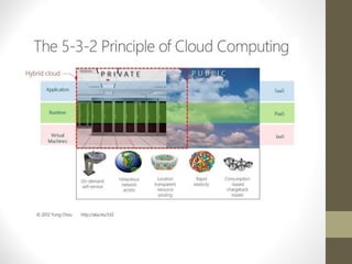 This document provides an overview of cloud computing concepts including definitions of public cloud, private cloud, hybrid cloud, community cloud, and cloud computing models like SaaS, IaaS, and PaaS. Key points covered include: