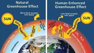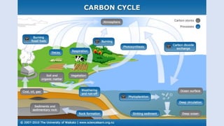 The carbon cycle describes the movement of carbon through Earth's biosphere, lithosphere, hydrosphere, and atmosphere. Carbon is exchanged between the atmosphere, living organisms, oceans, soil, rocks through various processes like photosynthesis, respiration, decomposition, combustion of fossil fuels and weathering of rocks. Human activities like burning fossil fuels and deforestation have increased atmospheric CO2 levels, impacting Earth's climate by enhancing the greenhouse effect.