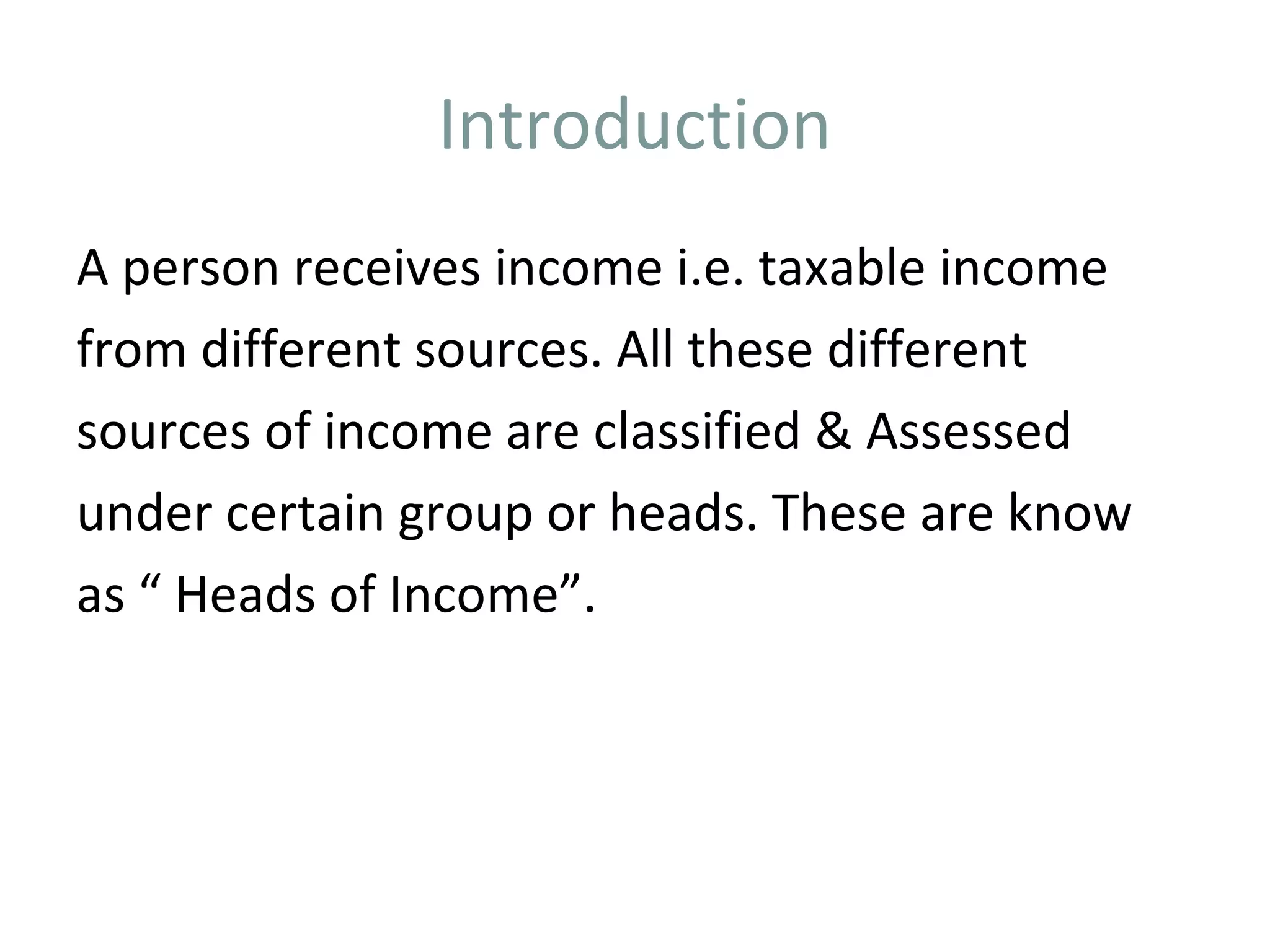 This document outlines the different heads of income under which a person's taxable income is classified and assessed in India. The key heads of income are: salary, house property, profits from business/profession, capital gains, and other sources. It provides details on what constitutes income from each of these heads, such as the types of allowances and deductions included in salary income or the conditions for business/profession income to be taxed.