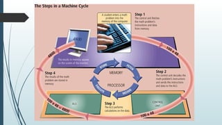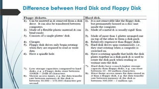 This document provides an overview of computer storage and processing devices, outlining the components of the system unit, including the motherboard and processor, as well as primary and secondary storage types. It explains the functions of memory, data representation, and various storage devices such as hard disks, SSDs, and optical devices, detailing their characteristics and differences. Additionally, it discusses ports, connectors, buses, and their roles in facilitating communication within the computer system.